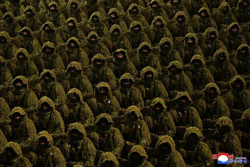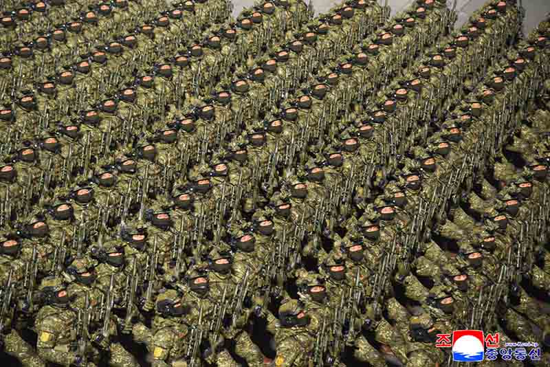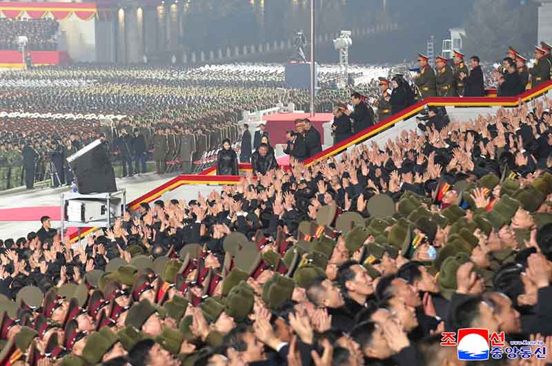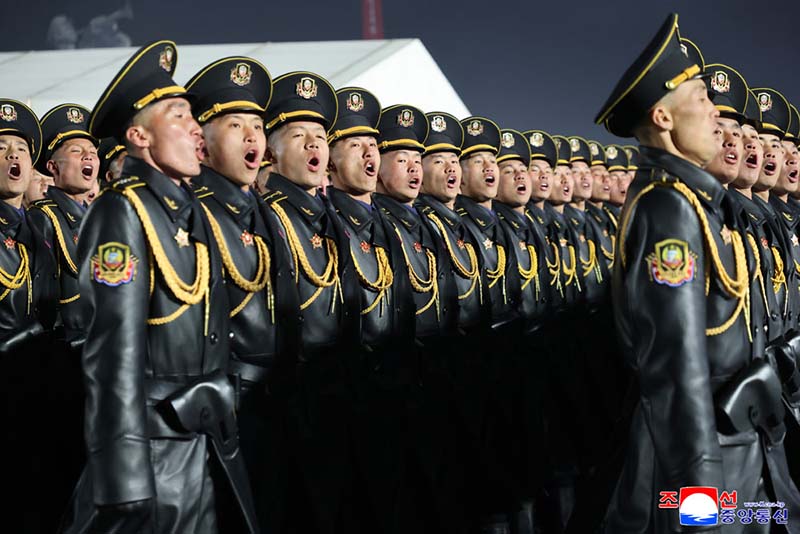 全ての閲兵隊員は、わが国家の偉大な変革の全盛期を開いたその気象、その気概で朝鮮労働党の新たな歴史的進軍を力強く牽引する厳かな誓いを込めて忠誠のスローガンを合唱した。