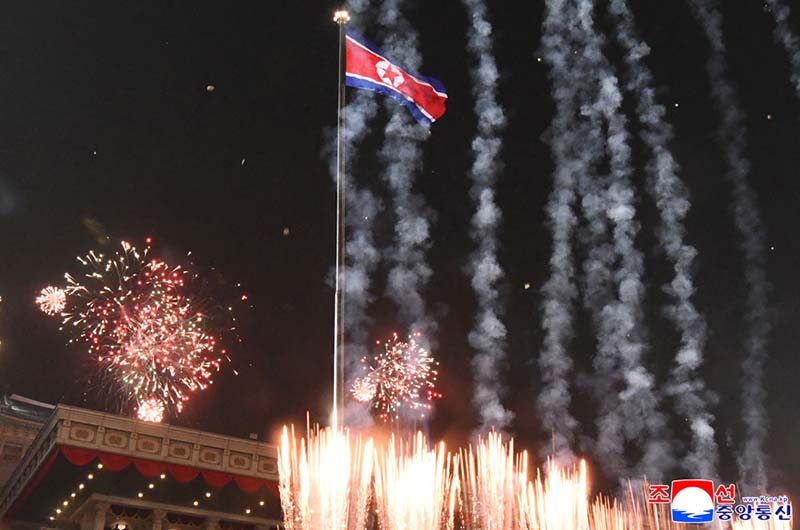 朝鮮労働党総書記で朝鮮民主主義人民共和国国務委員長である金正恩同志が閲兵広場に到着すると、嵐のような「万歳!」の歓呼の声が天地を震撼させ、花火が打ち上げられて首都の夜空に素晴らしい火花の海を広げた。