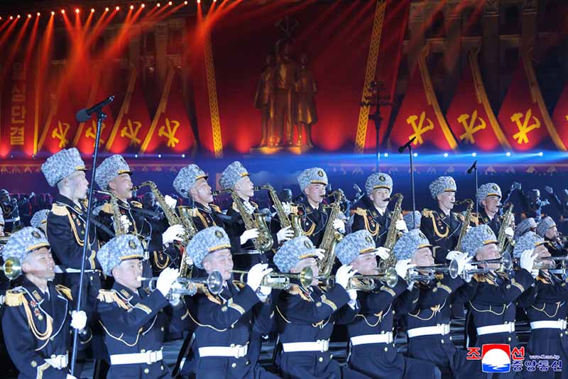 閲兵式の序幕を飾って国防省中央軍楽団と朝鮮人民軍各級連合部隊の軍楽隊、社会安全省の女性吹奏楽団からなる総合軍楽隊が、軍種別特性と趣を生かし、強兵の威力を見せる底力あって気迫が溢れる曲調と軽快なリズムで軍楽礼式を披露した。