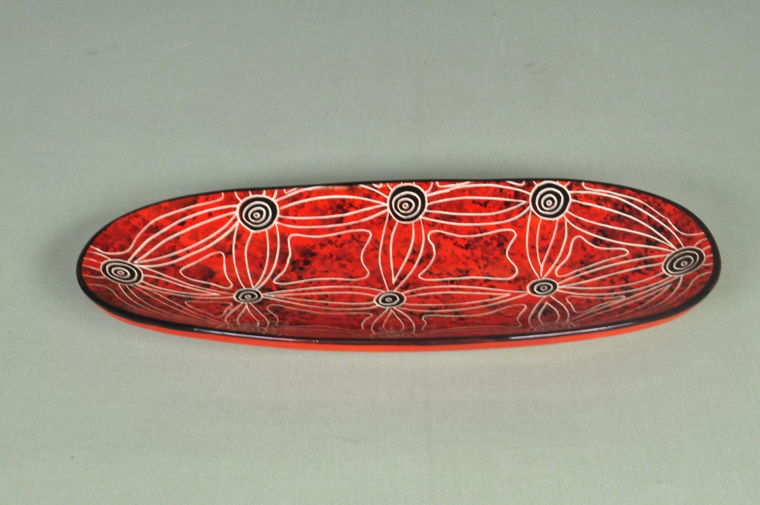 オーストラリアの有名な先住民工芸品製作会社で特別製作した飾りつけの焼き物の皿です。オーストラリアの東南地域に住む先住民の芸術家が先祖伝来の方法で作ったものです。