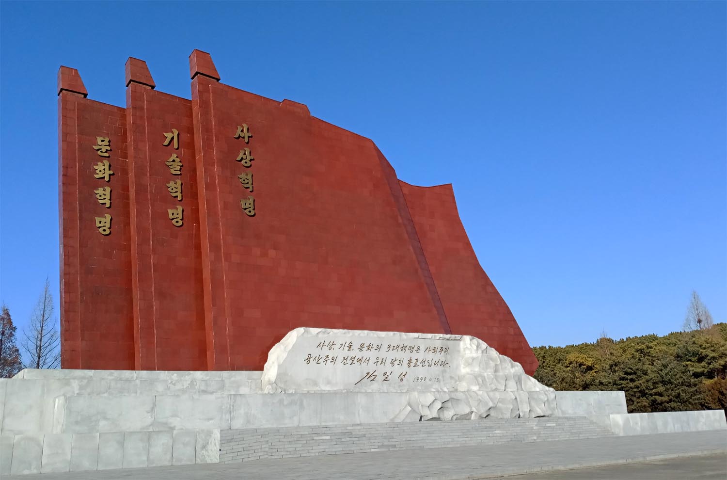 「3大革命展示館は、朝鮮人民が3大革命を行う過程に収めた成果を集中的に展示して紹介する総合的な拠点です。金正日国防委員長は、1990年代に3大革命展示館を今のような見事なものに建てるよう取り計らいました。そしてここで全国3大革命展示会を盛大に開催するようにしました。このように3大革命展示館は思想、技術、文化の3大革命を力強く展開して、追いつけ追い越せ、見習い運動を促し、3大革命にさらに活力を吹き込んで、社会主義建設を推し進める上に大いに寄与しました。展示館には思想、技術、文化の3大革命を象徴する三つの赤旗を象った3大革命記念塔が建てられています」