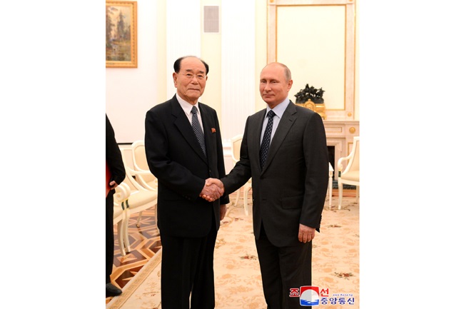 「国際サッカー連盟2018年ワールドカップ」の開幕行事に参加する為ロシアを訪問中の朝鮮民主主義人民共和国最高人民会議常任委員会金永南委員長が、14日、クレムリン大宮殿でウラジーミル・プーチンロシア連邦大統領に会いました。
