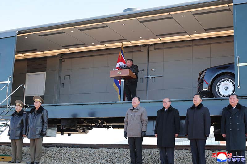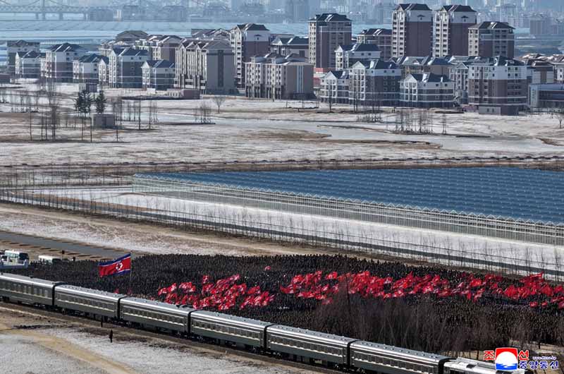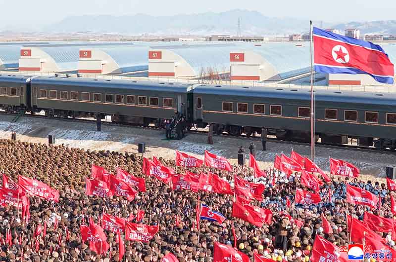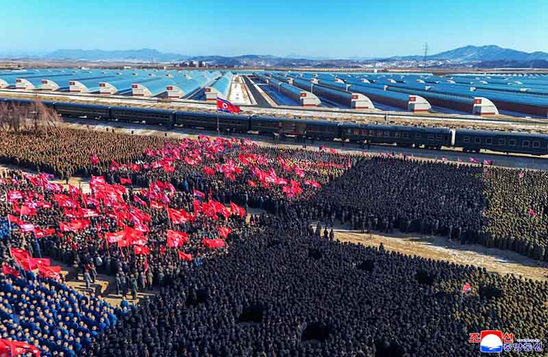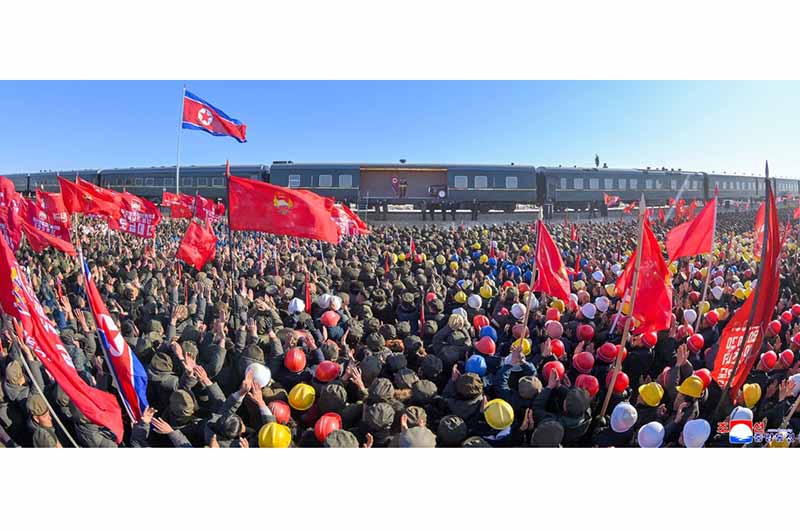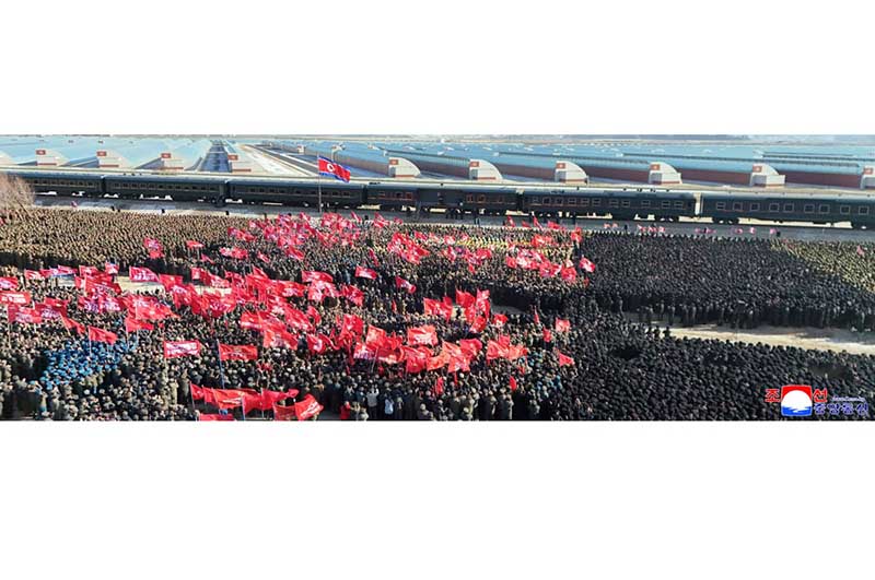 金正恩総書記が専用列車から降りると、全ての青年建設者は意義深い新年の初の指導の足跡を自分たちの建設現場に印し、慈父の温かい祝福を与える総書記を仰いで熱狂的な歓呼の声を上げ続けた。