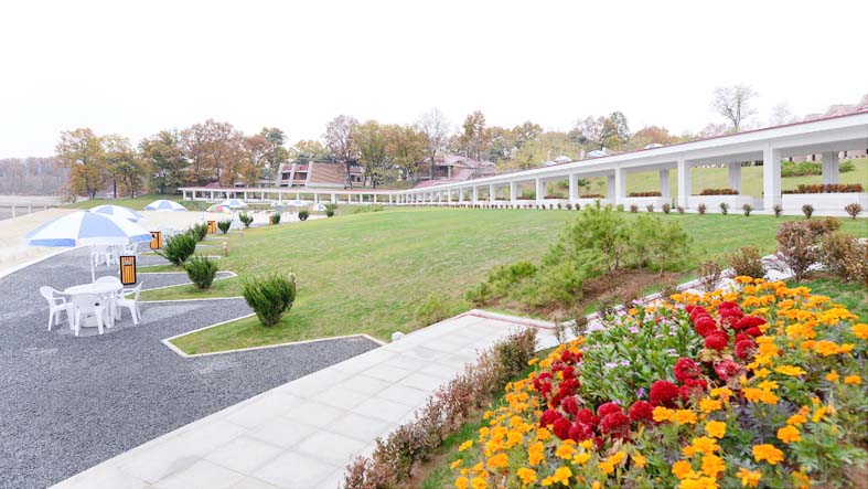 その年の秋、ヨンプン科学者保養所が見事に完工しました。さざなみが立つ湖畔に連なる小高い丘、緑に覆われた保養所。完工した保養所を訪れた金正恩委員長は、船に乗ってここへ来る時、眺められるヨンプン科学者保養所は一幅の絵のようだった、私が描いて見た素晴らしい風景がそのまま現実に生まれた、うっそうとした林の中にくっきりと現われた絶景だと言ってとても喜びました。現地指導の道であつらえ向きの場所を見るたびに、そこに建てられる人民のものを描きだしては明るく微笑む金正恩委員長なのです。