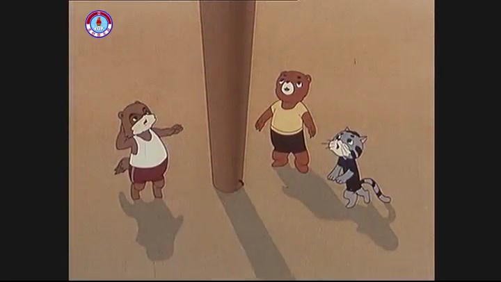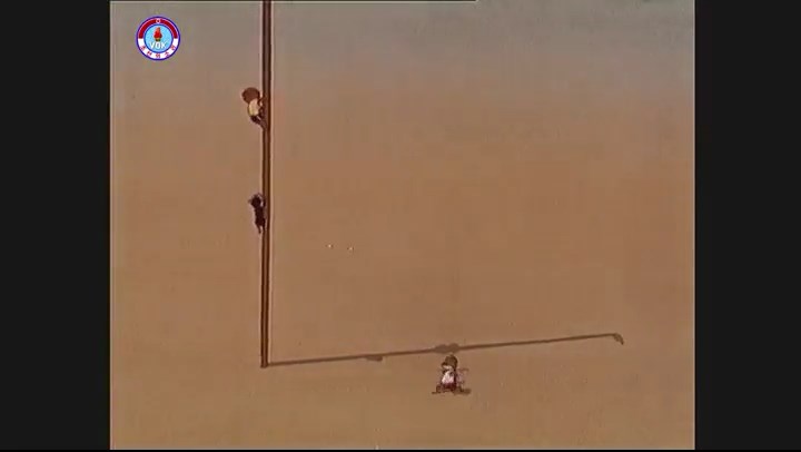 ※一番乗りのクマが巻尺の端を竿の下に留めて登り始める、追いついたネコも巻尺の端を竿の下に留めて登り始める。タヌキも追いつく。