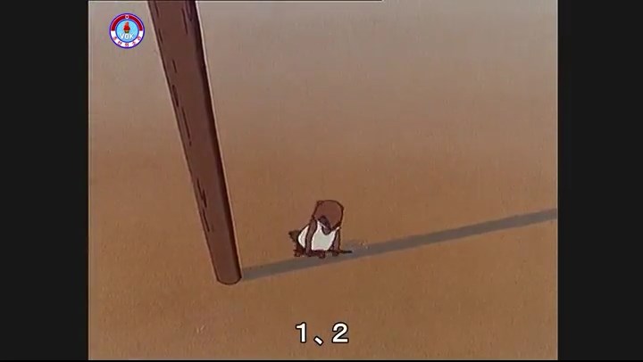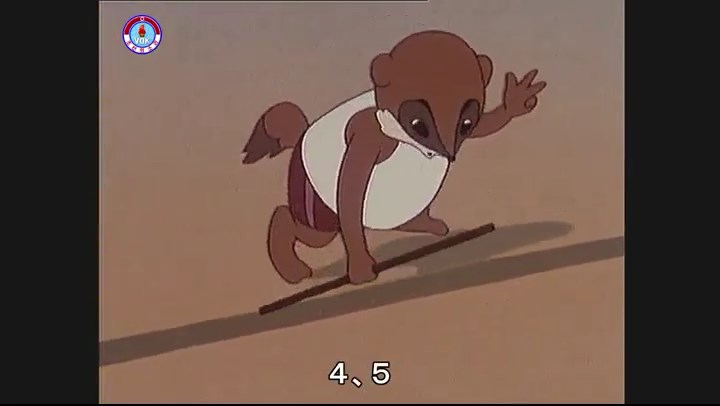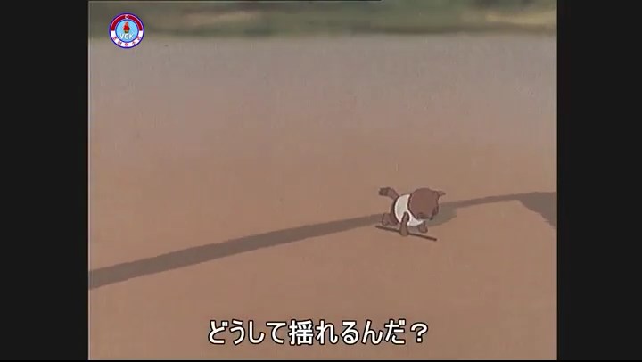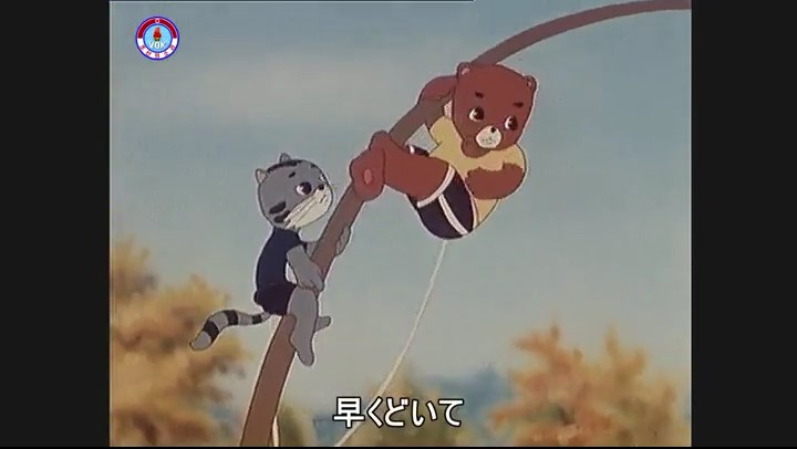 「あっ、パンツが脱げてる さあ」(※タヌキのパンツがずり落ちる描写。吊るされた竿(棒)を登る練習をしているが、落ちる)
