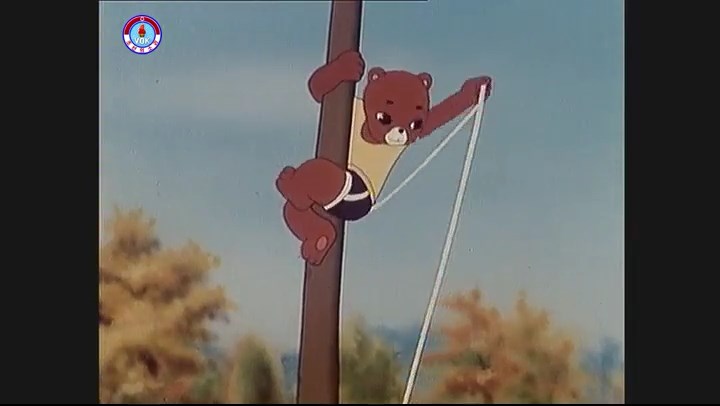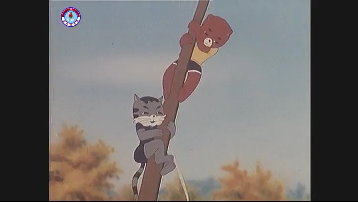 ※軽々と登るクマとネコ。ヒモが切れて落ちる。地面に突き刺さる竿。
