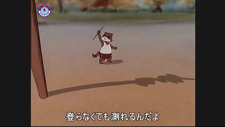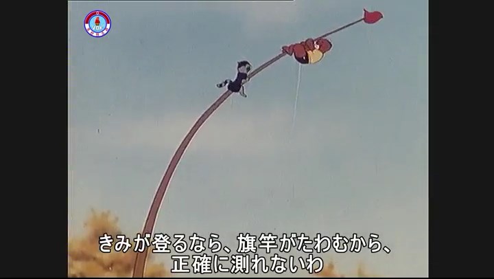 ※ネコ、竿のてっぺんに昇り測ろうとするが巻尺が外れている事に気づき下に降りる。