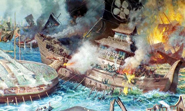 この先駆けの艦船が見乃梁(キョンネリャン)と言う早瀬を抜け出して広いハンサン島の沖に殆どの敵船をおびきだした時、リ・スンシン将軍は一斉攻撃を命令しました。亀甲船を先頭にする朝鮮艦隊は正面と両翼から日本の艦隊を完全に包囲し、強力な火砲射撃で数十隻の敵船を焼き払いました。
