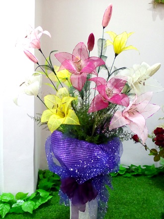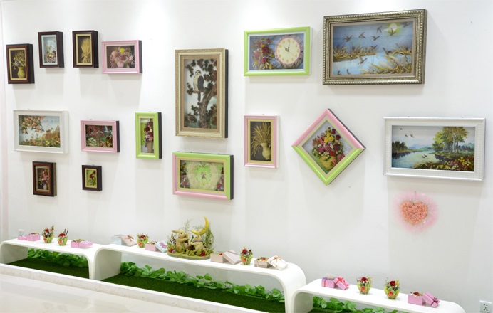 ユニークなのはプリザーブドフラワーで表した自然風景画と大きなユリの花瓶です。ユリの花瓶は木の葉を試薬で処理して葉緑素の部分を取り除き、そこに色素を注入して製作した木の葉の材料で作りました。ここで作られるプリザーブドフラワーは生け花と同じ色と模様、柔らかい感覚で好評を博しており、その需要も高まるばかりです。
