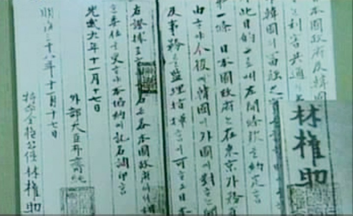 国連憲章とウィーン条約によりますと国際法の基本の原則に反する条約は、効力がないと規定されています。「万国公法」第406章は「条約には必ず国王の承認があって実行されるし、国王の批准がないとすなわちごみとなる」と規定しています。実際に1992年、南朝鮮で発見された「乙巳5条約」の原文には、朝鮮皇帝のサインと国璽の捺印がありません。ニューヨークのコロンビア大学図書館でも、朝鮮の皇帝コジョンが「乙巳5条約」が無効であることを指摘し、各国元首に送った親書が発見されました。こうした事実は「乙巳5条約」が、日帝の捏造品であることを雄弁に物語っています。