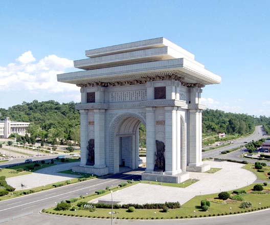ピョンヤンのモラン峰*1の麓に建てられた凱旋門です。凱旋門はチュチェ34(1945)年、国を解放して凱旋した偉大な金日成主席の不滅の業績を末永く伝えるモニュメントです。