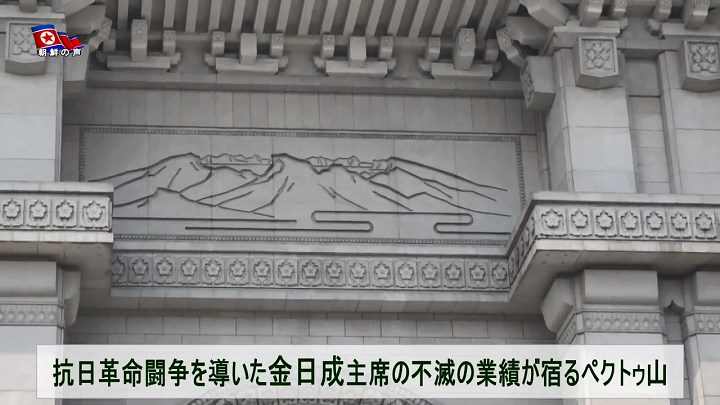 2階の前と後ろの面の中心には不滅の革命賛歌「金日成将軍の歌」が刻まれており、左と右の壁面にはペクトゥ山*2が描かれています。ペクトゥ山には抗日革命闘争を勝利へと導いた主席の栄光輝く革命活動の歴史が秘められています。