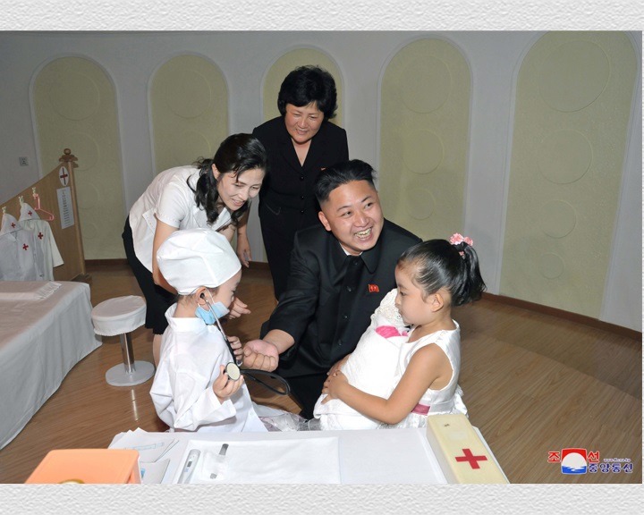 チュチェ101(2012)年7月のある日、金正恩委員長がチャンジョン通り*1に建てられたキョンサン幼稚園を訪れた時のことです。幼稚園の各所を見た金正恩委員長は医者ごっこに夢中になっている子供たちにも会いました。診察ガウンを着て聴診器を首にかけた豆医者が看護婦姿の子供と一緒に座って患者を診察し、治療する真似をしていました。