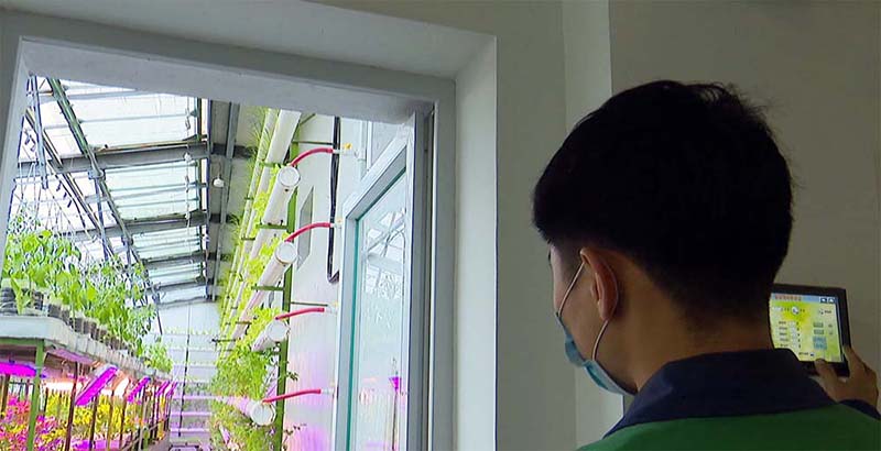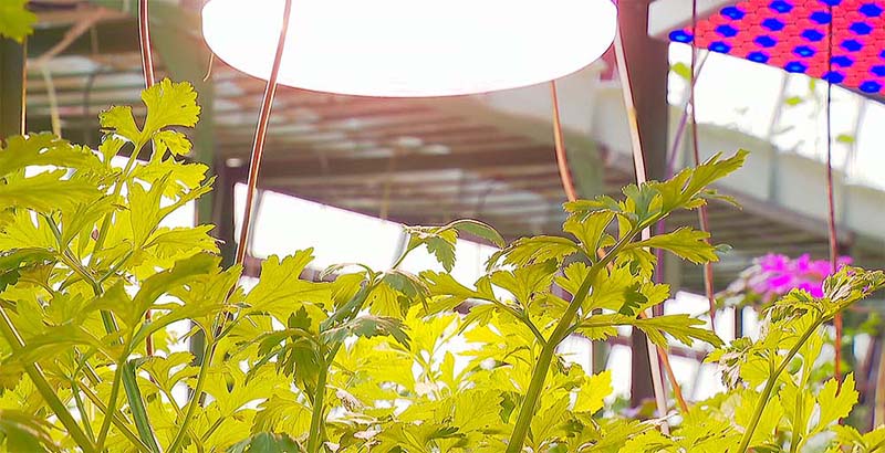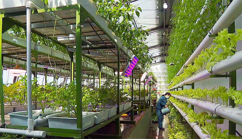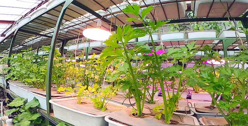ハウスの限られた面積に作物を立体的に配置して、空間を合理的に利用しています。野菜の生長を促進するため、カラフルな灯りをつけ、その電源は自然エネルギーで賄っています。ハウスの下の水温25度の水では、ナマズが養殖されていますが、その熱は冬の野菜栽培に利用されるとのことです。