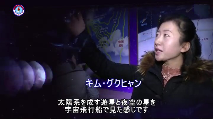 叡智に富んだ朝鮮民族の誇りを感じ天井に銀河系を表わしたホールを経て、宇宙の進化過程を見せるパネルの前に行きました。