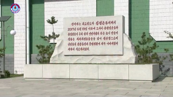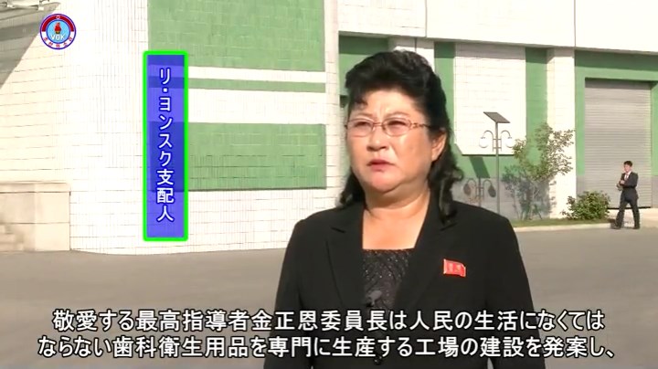 「敬愛する最高指導者金正恩委員長は人民の生活になくてはならない歯科衛生用品を専門に生産する工場の建設を発案し、建設と運営上の懸案を全て解決してやりました。チュチェ106(2017)年6月、新築された工場を訪れた金正恩委員長は素晴らしい工場がまたひとつ建てられた、と大いに喜びました。そして各生産工程を見て、歯科衛生用品の生産工程がとても近代的で、品質も良いと評価しました」