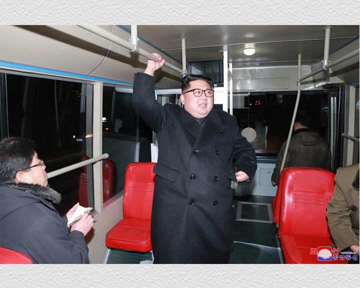 チュチェ107(2018)年2月、新型のトロリーバスの試運転が行われたときのことでした。数日前、ピョンヤン・トロリーバス工場を訪れて、工場の労働者がつくった新型のトロリーバスを見た金正恩委員長はこの日、私が直々乗って見なければ気がすまないと言って、夜遅く、トロリーバスに乗って市内を回りました。