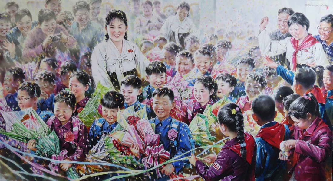 朝鮮画「祖国の未来」は、学校に新しく入学する子供たちだけでなく、大人たちもお祭り気分でにぎわい、国中が喜びに包まれる日である4月1日を描いています。