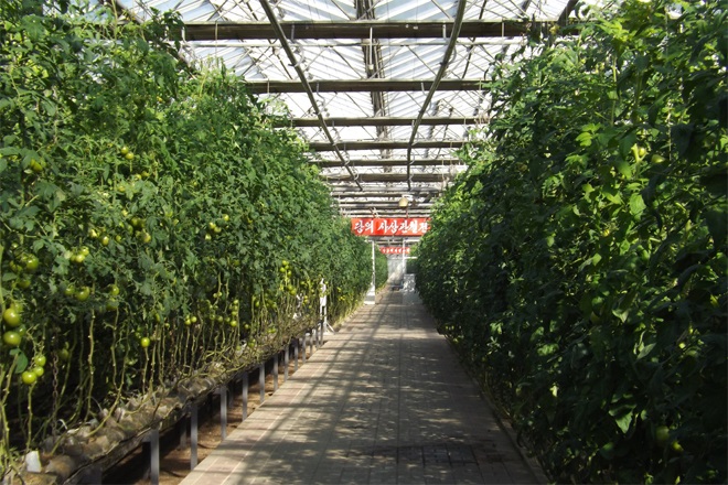 ピョンヤンに百数十ヘクタールの総敷地面積を持つ野菜の研究および生産施設があります。農業研究院ピョンヤン野菜科学研究所です。すべての工程がコンピューターによって自動的に制御される近代的な水耕ハウスとビニールハウス、先端生物工学の研究設備が完備した研究所では、野菜のハウス栽培を一層科学化、集約化して、ヘクタール当たり数百トンの野菜を生産しています。