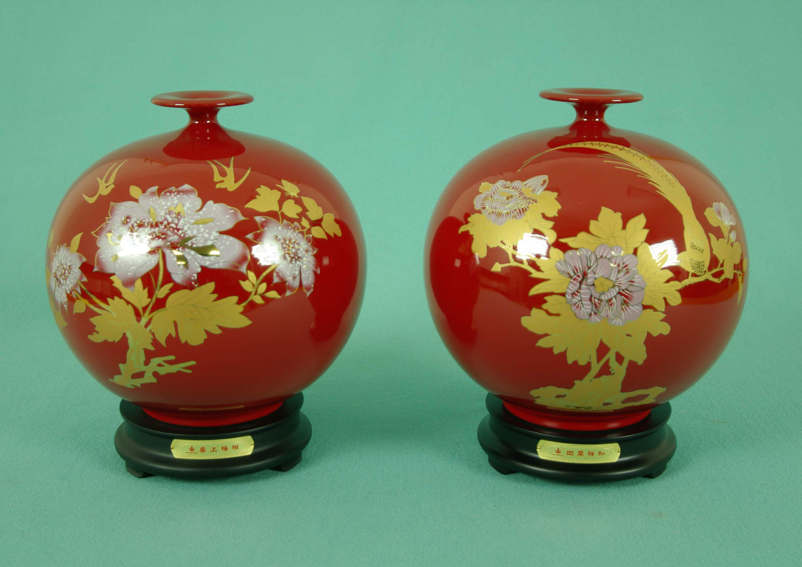 この焼き物の花瓶は、チュチェ97(2008)年2月、金正日総書記の誕生日の光明星節に際して張蔚華さんの遺族から贈られたものです。この2点の焼き物の花瓶は中国の伝統的な皇室の焼き物です。高さ25センチメートルの花瓶には、美しい花と鳥が描かれています。