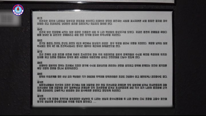 カンファ島に上がっては朝鮮封建政府に談判を強要しました。数日間の談判で12ヵ条から成る『カンファ島条約』が強制的に締結されました。条約は「釜山港他2港を更に開港しそこで関税貿易を行う事が出来る」と規定し、日本が朝鮮で何の制約も受けずに経済的略奪が出来る保障をもたらしました。また日本の朝鮮沿海測量の作成権と共に開港上に住居する日本人の治外法権的地位を規定しました。