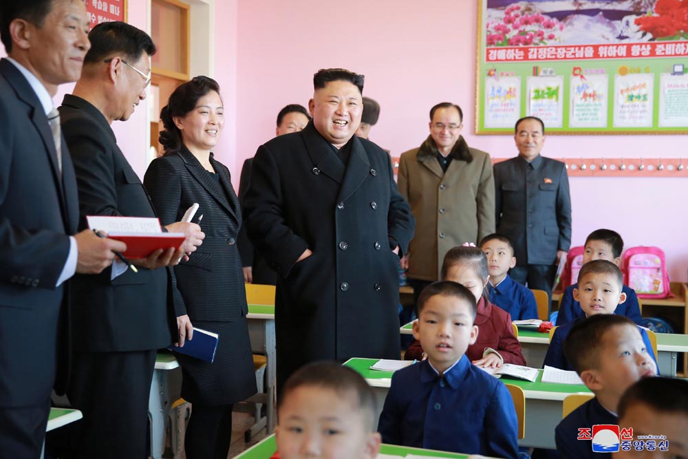 総書記は、国語の授業が行われる2年1組にも入って見ました。子供たちは、先生の質問に大きな声で元気良く答えました。総書記は物分りがとてもよいと評価し、子供たちの国語のノートを開いては、字がきれいだといって、頭をなでてやりました。