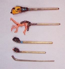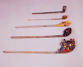 その時期に、髪を後ろで束ねてかんざしを挿した髪型が広く流行したことから、かんざしの材料と装飾がいっそう多様になったことが分かります。材料によって、金製、銀製、白銅製などのかんざしがあり、装飾によって、鳳、竜、菊の花などの形を頭部に刻んだかんざしがありました。また、その大きさもまちまちでしたが、10センチ内外のものから30センチ以上のものもありました。