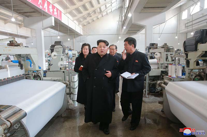「2013年10月12日、工場を訪れた金正恩総書記は、私は国中の生徒、学生皆に制服を作って着せようと思っている、そのためにはこの工場で生地の生産に精を出さなければならないと言いました。総書記は2014年12月19日、再び工場を訪れ、制服用の生地を一つ一つ見て、生徒、学生に制服を着せるのは労働党が一貫して堅持してきた政策である、これはお金があればやり、なければ止めても良いということではなく、何が何でも必ずやり遂げなければならないことだと言いました」