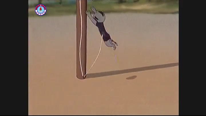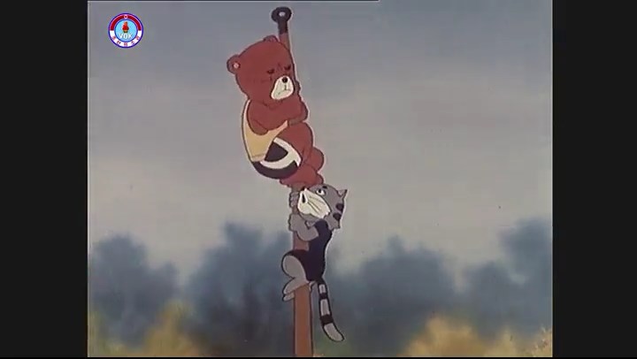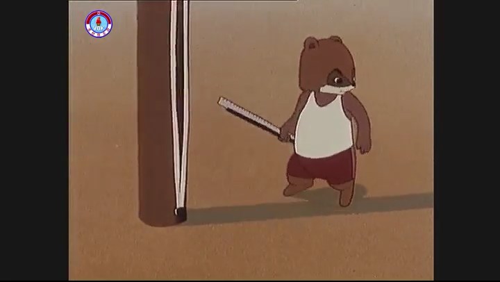 ※一番乗りのクマが巻尺の端を竿の下に留めて登り始める、追いついたネコも巻尺の端を竿の下に留めて登り始める。タヌキも追いつく。