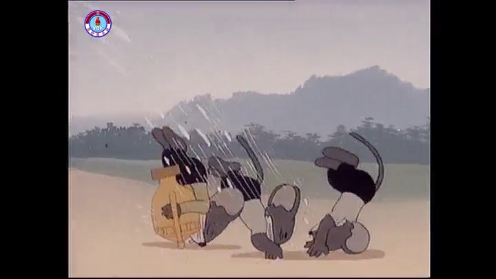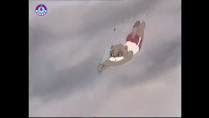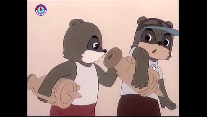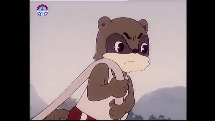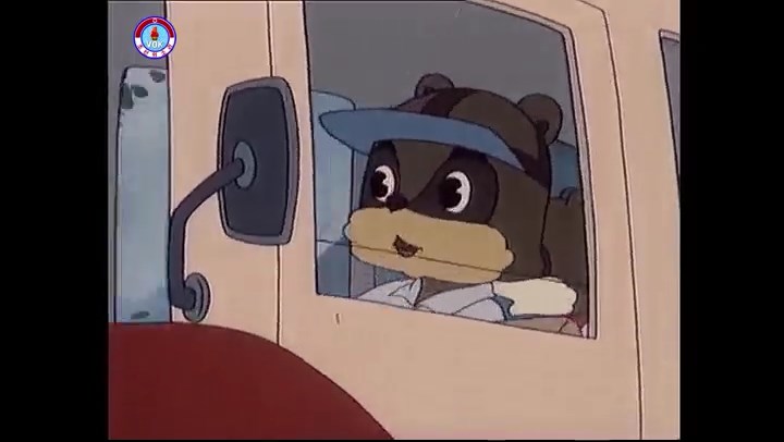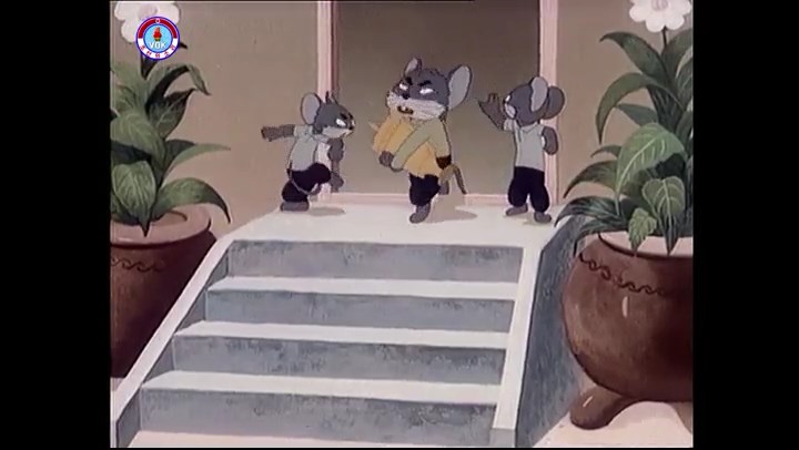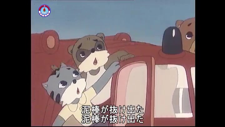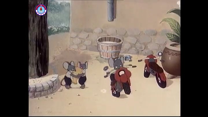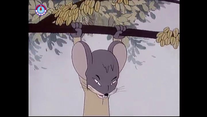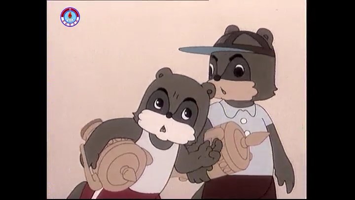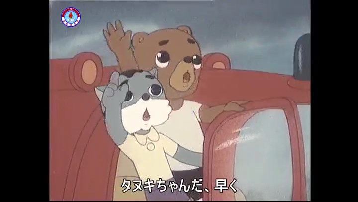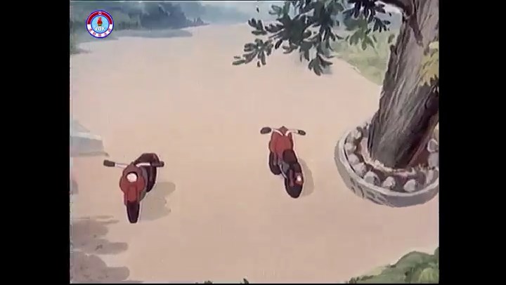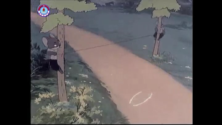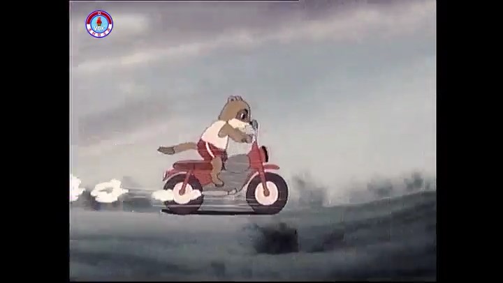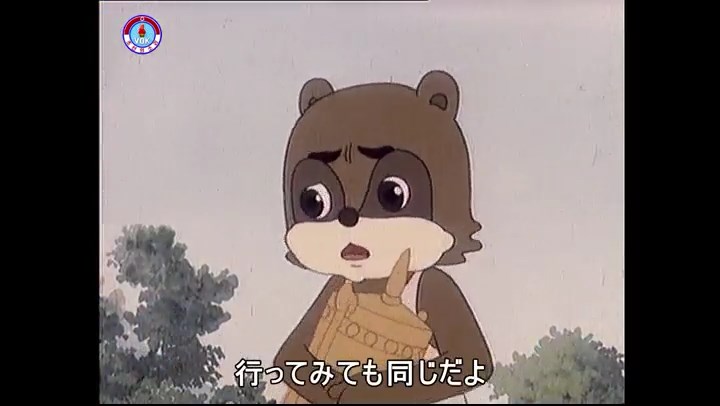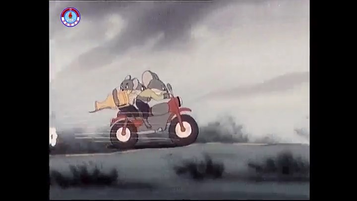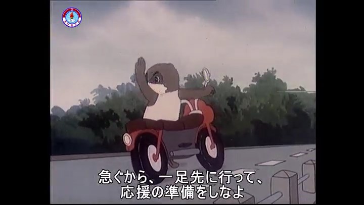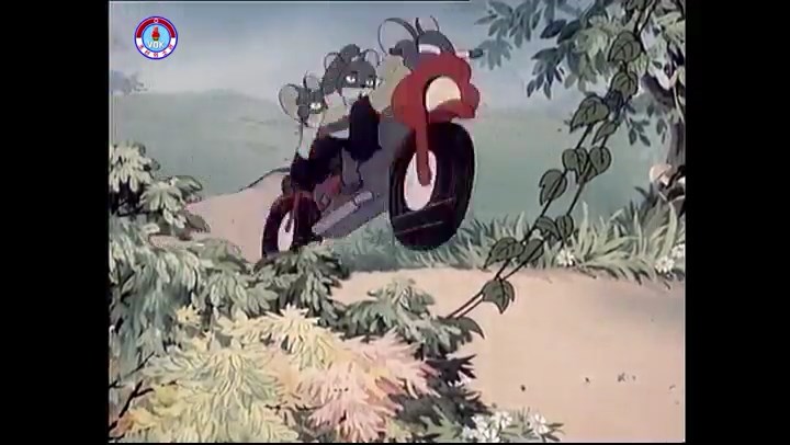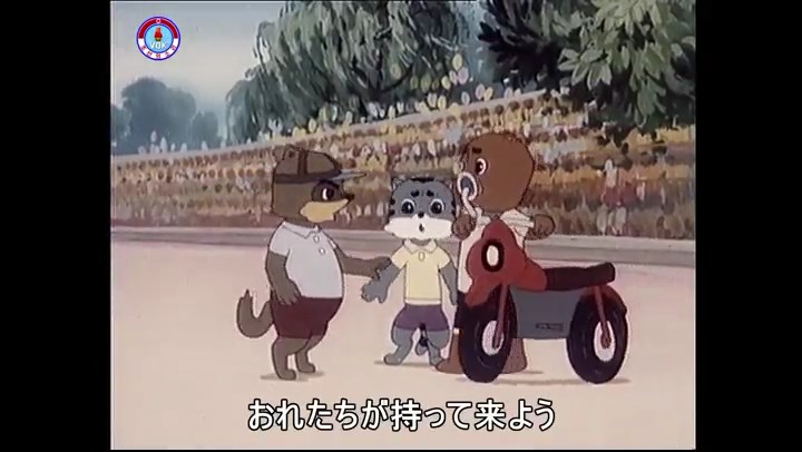 ※逃げる途中で蔓草を手に入れるネズミ。2匹がそれを道の両側の木に結び付ける。首を引っ掛けてしまうタヌキ(良い子は真似をしてはいけない)。反動で飛ばされて行く。タヌキが乗って来たバイクを奪って逃走。