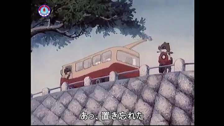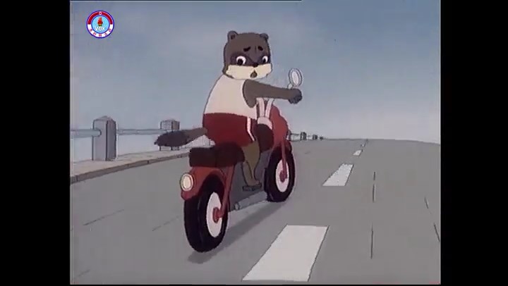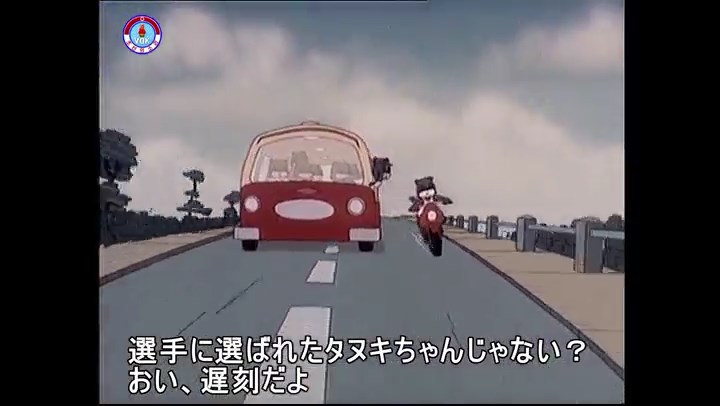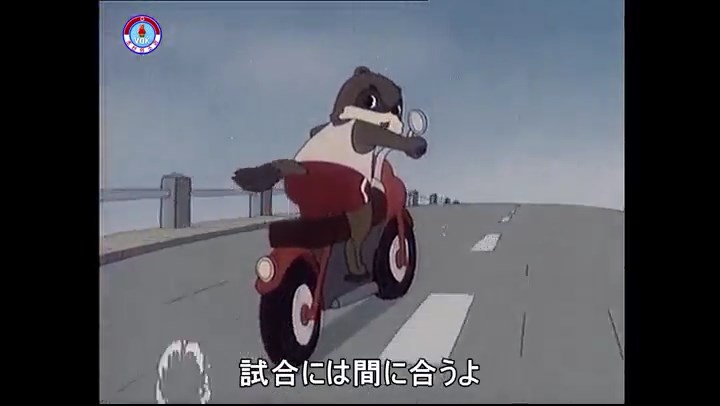※バイクで走る主人公のタヌキ。前方を行くバスに競技委員?のタヌキ。