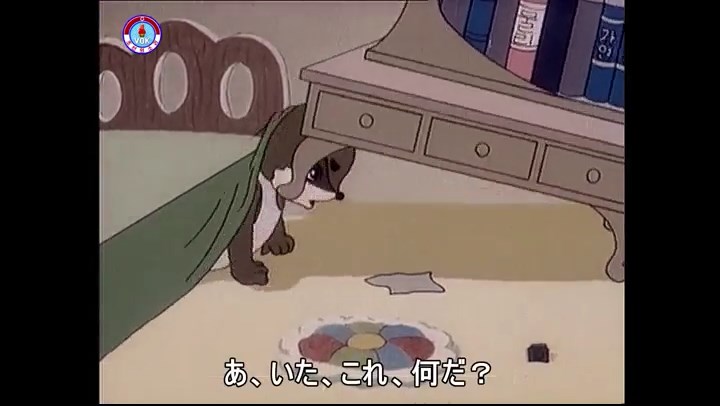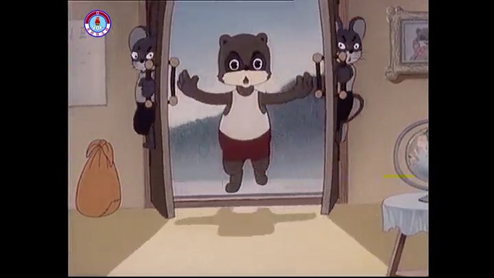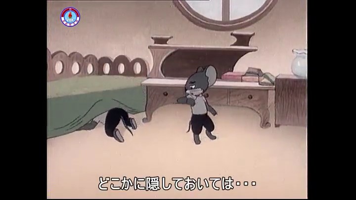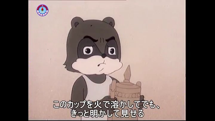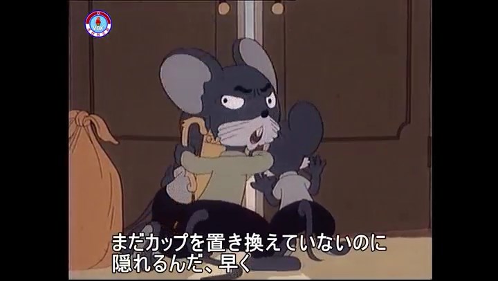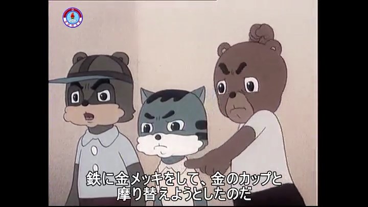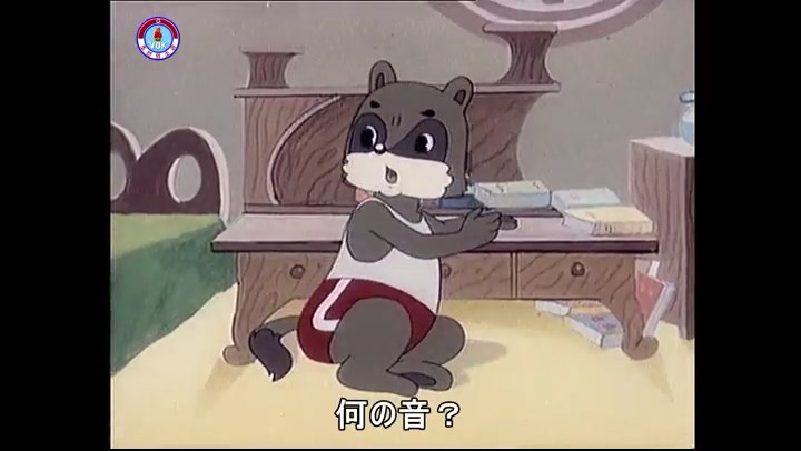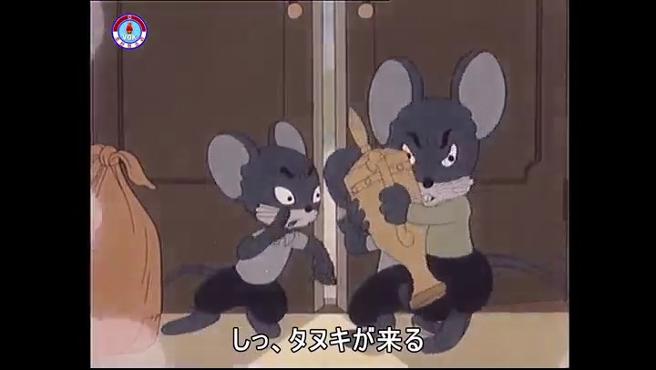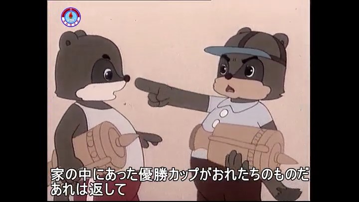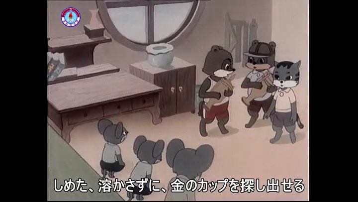 ※タヌキの家で優勝カップを偽物とすり替えようとしているネズミ一味。そこへタヌキが帰って来る。
