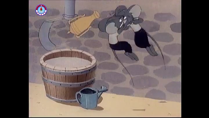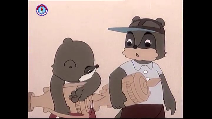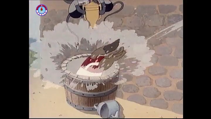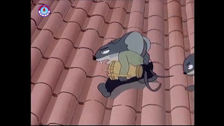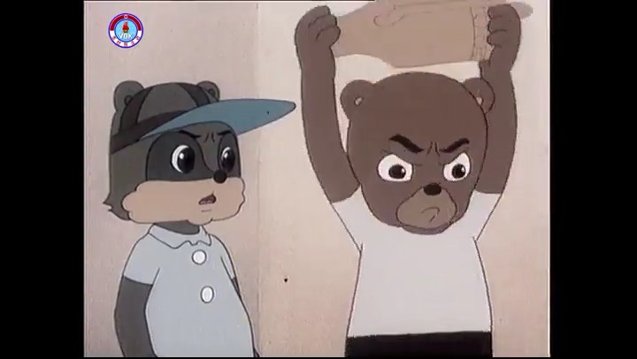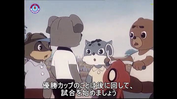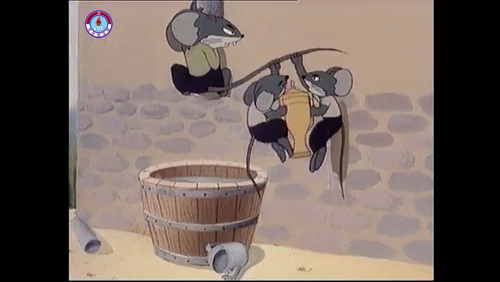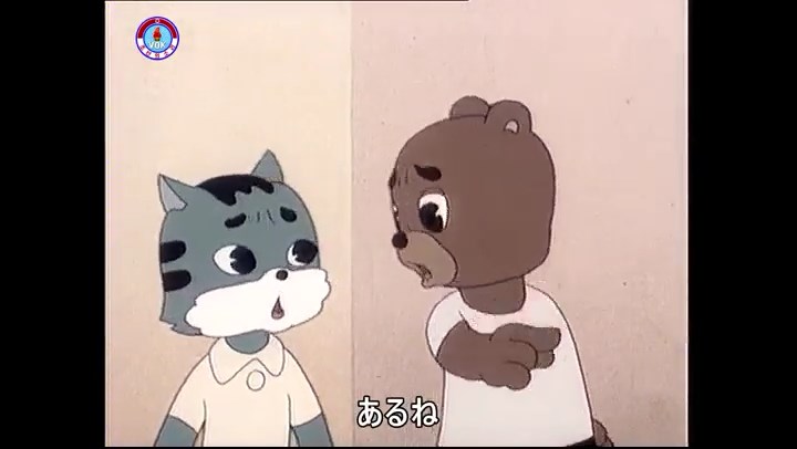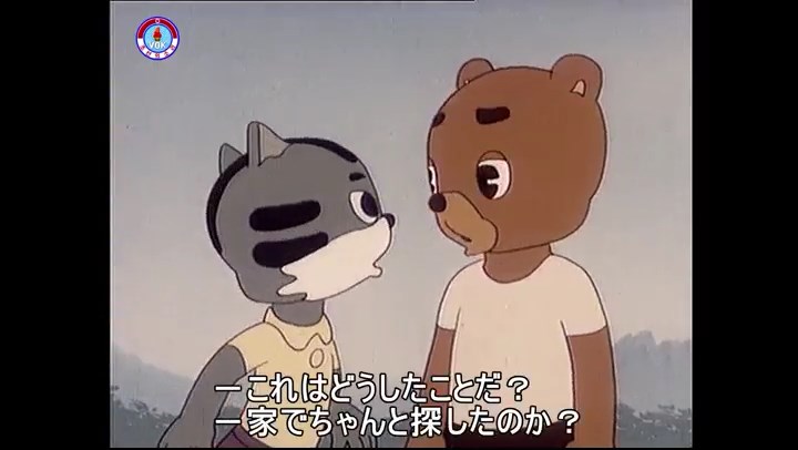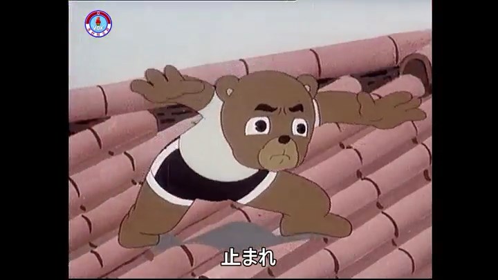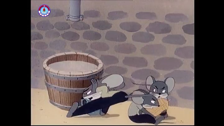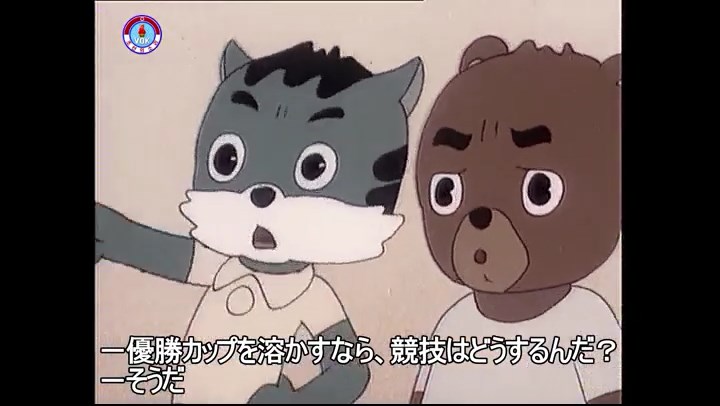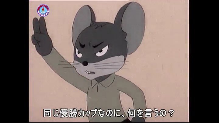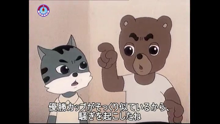 ※隠れていたネズミ達が本物の優勝カップを持って外に出ようとする。そこへクマとネコがやって来る。ネズミが投げた優勝カップが雨樋に当たる。