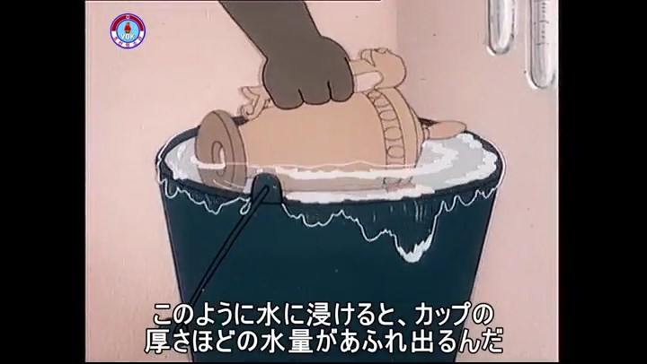「このように水に浸けると、カップの厚さほどの水量があふれ出るんだ」