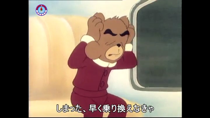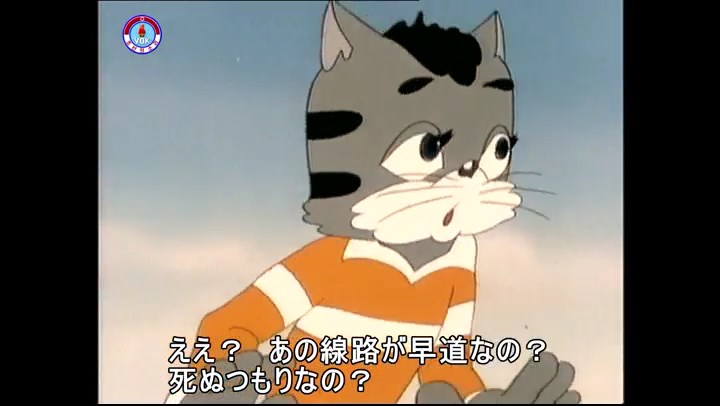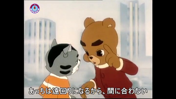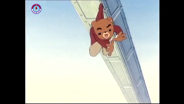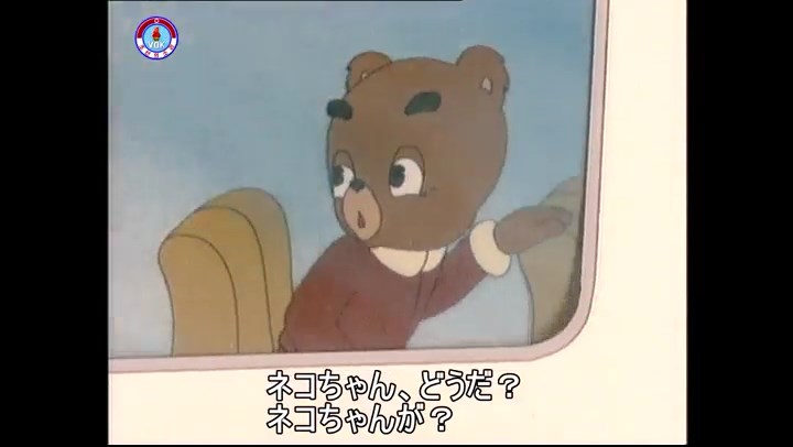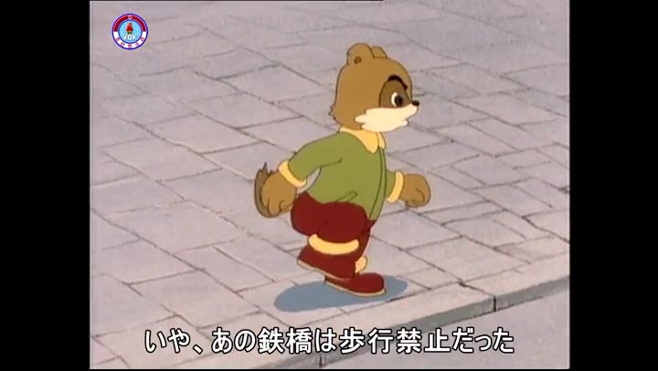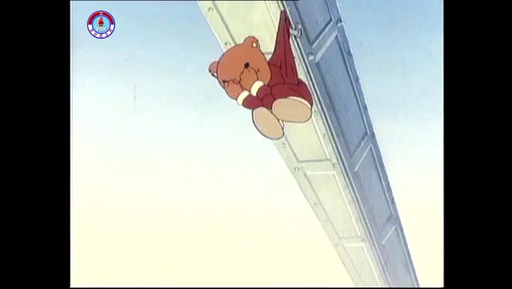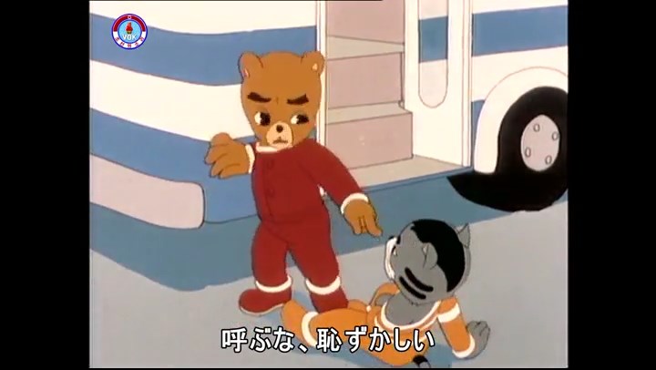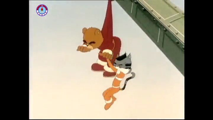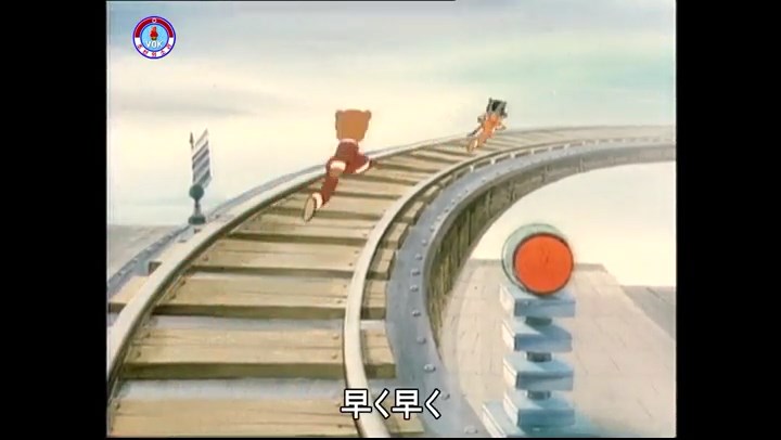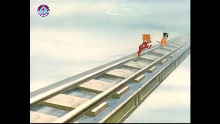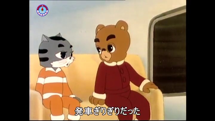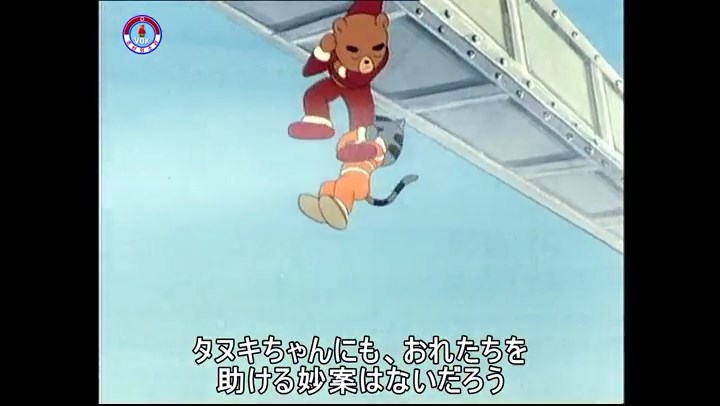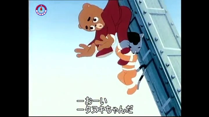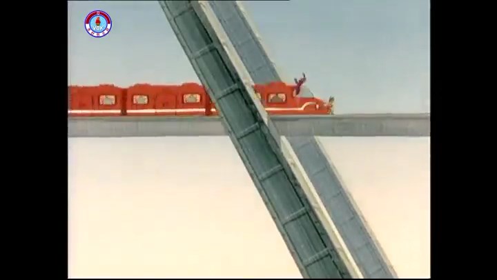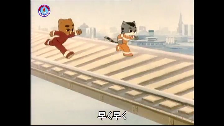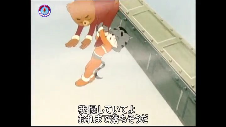 ※列車に撥ねられて鉄橋から落ちるネコとクマ。クマの服が鉄橋の金具?に引っ掛かってぶら下がる。そのクマの足に掴まるネコ。