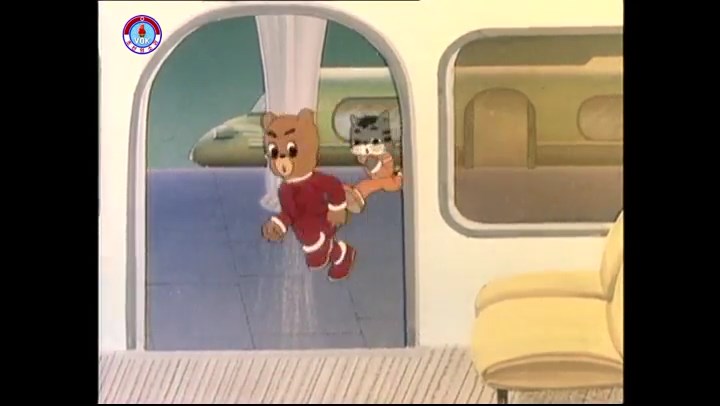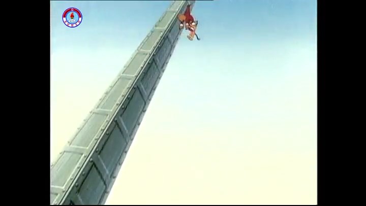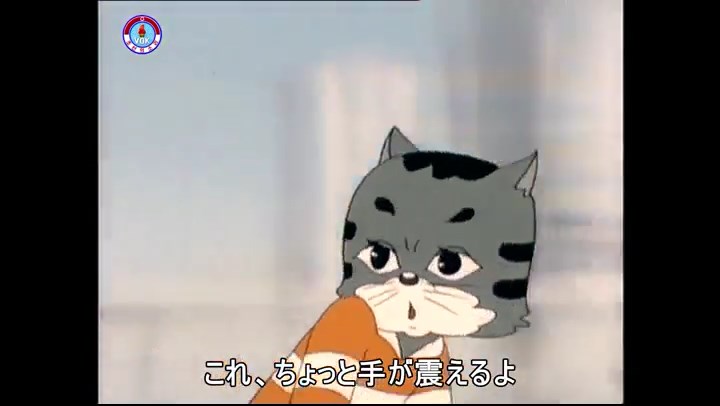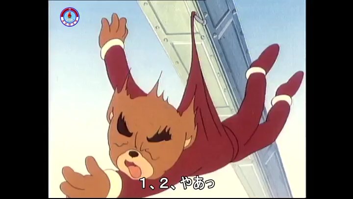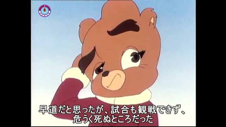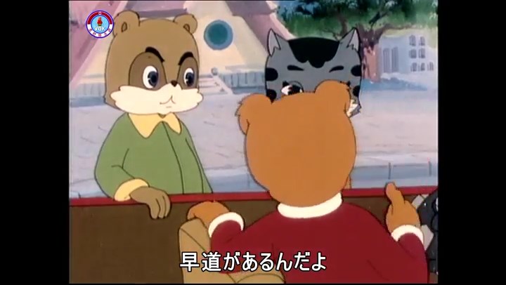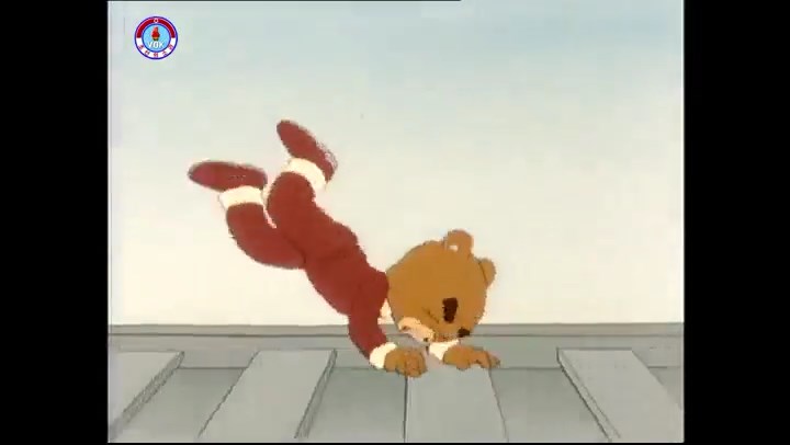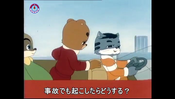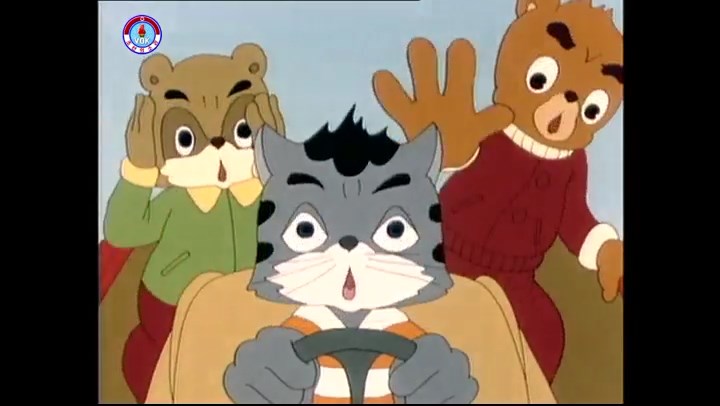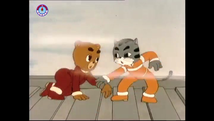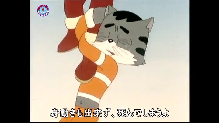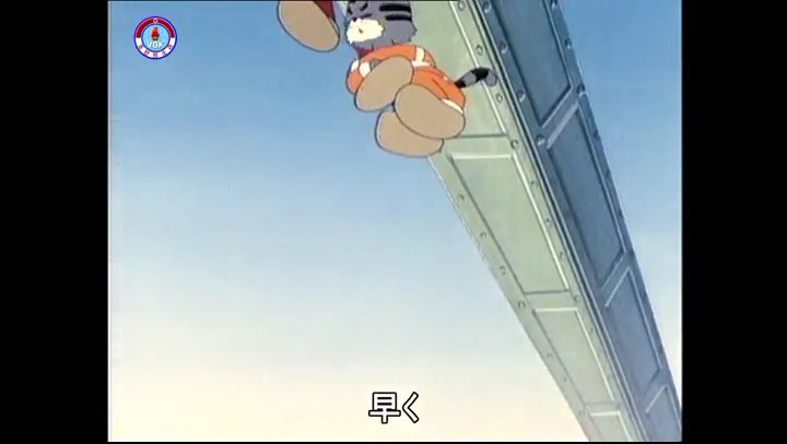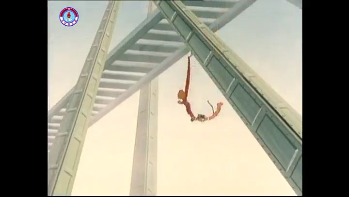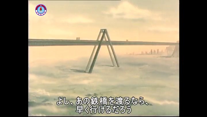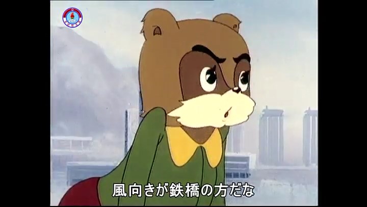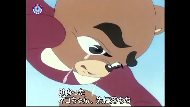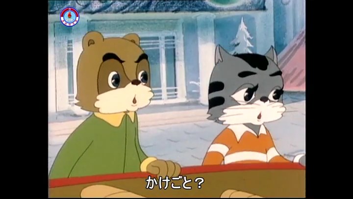 ※列車に撥ねられて鉄橋から落ちるネコとクマ。クマの服が鉄橋の金具?に引っ掛かってぶら下がる。そのクマの足に掴まるネコ。