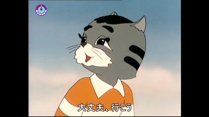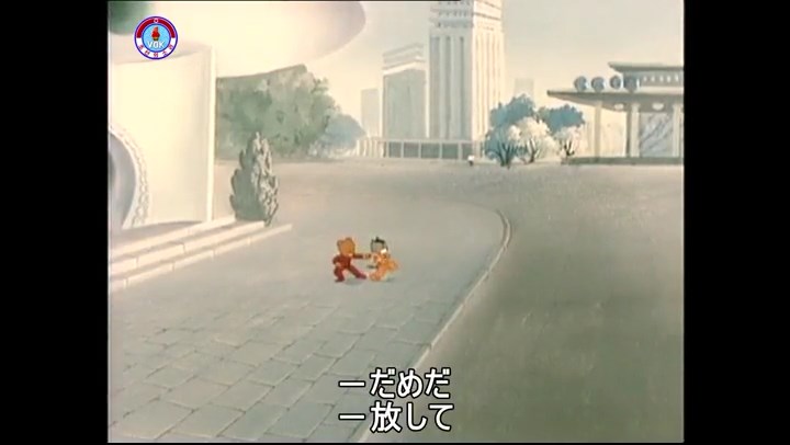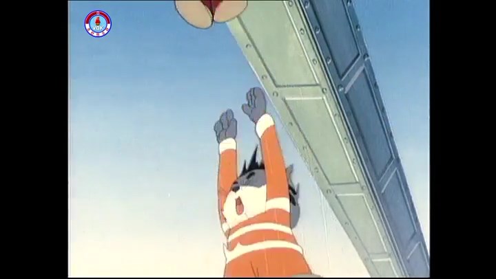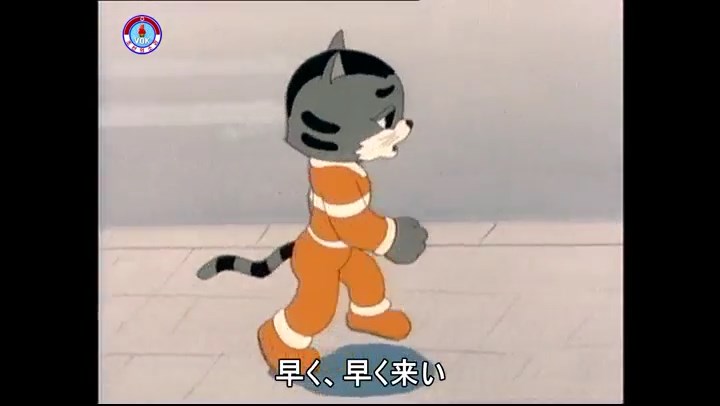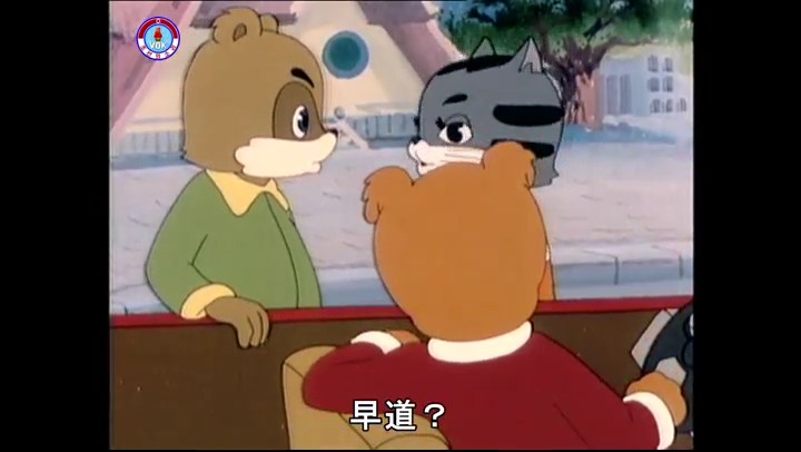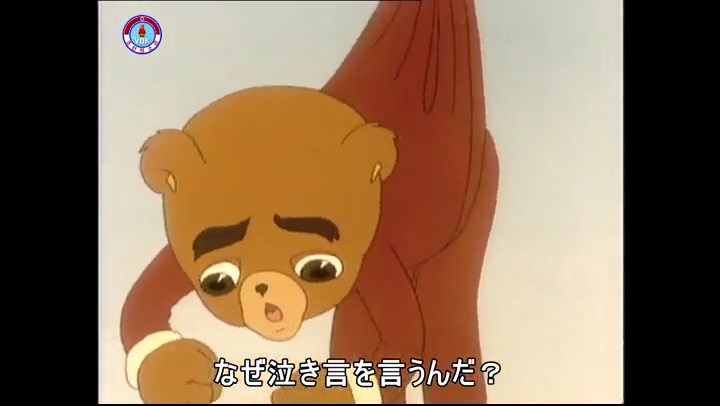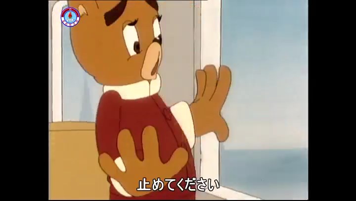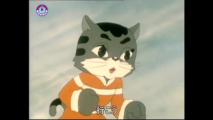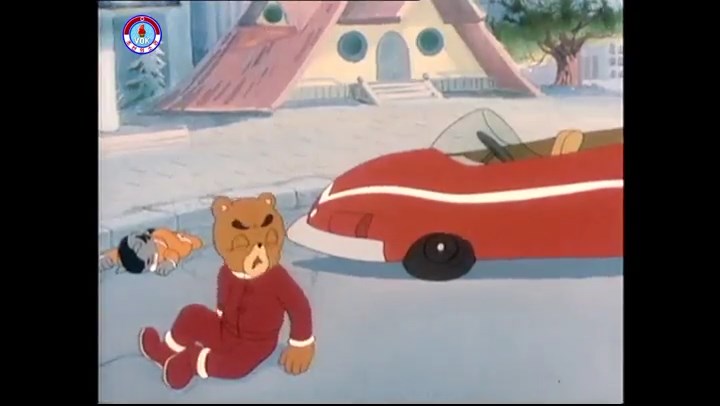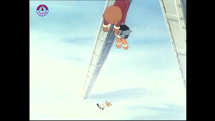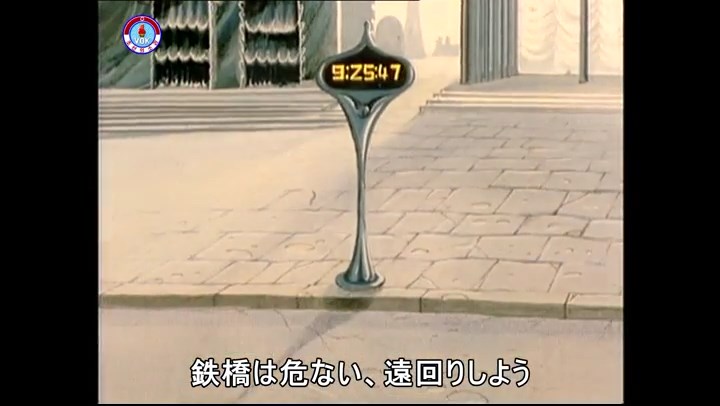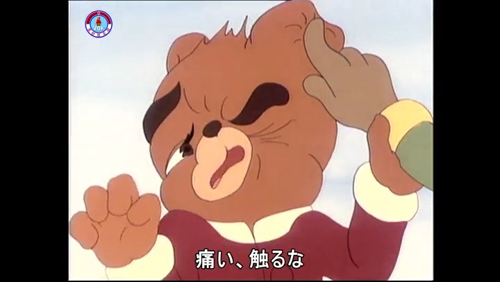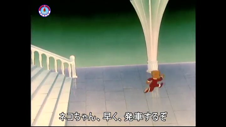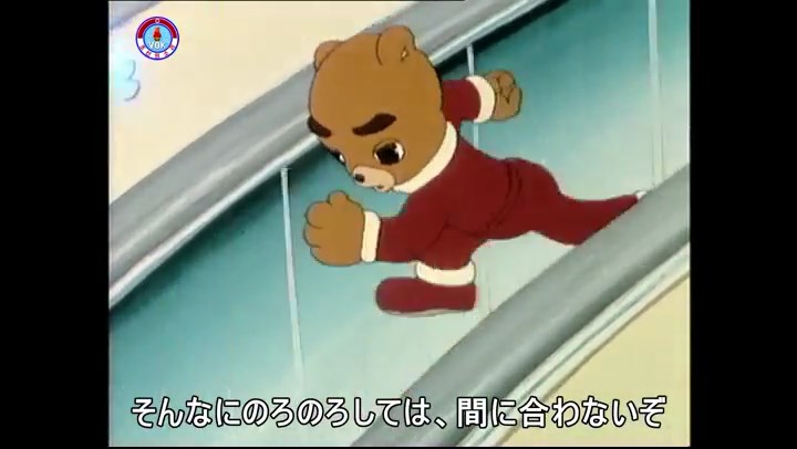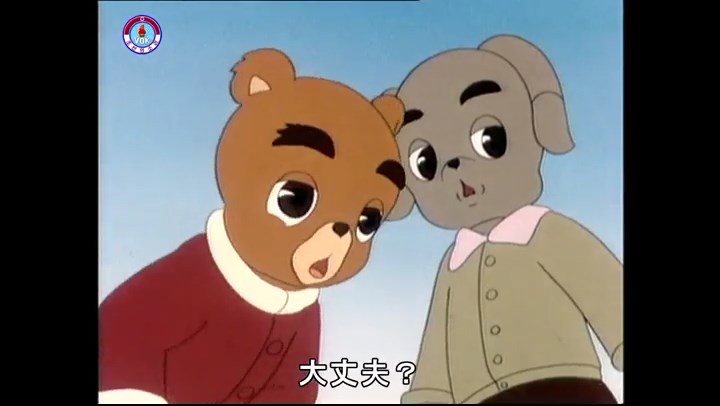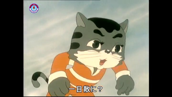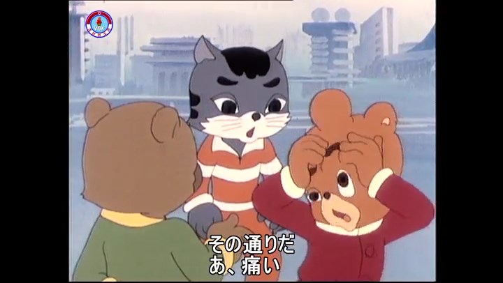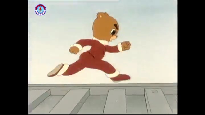 ※列車に撥ねられて鉄橋から落ちるネコとクマ。クマの服が鉄橋の金具?に引っ掛かってぶら下がる。そのクマの足に掴まるネコ。