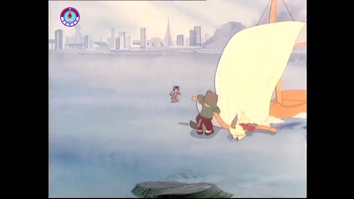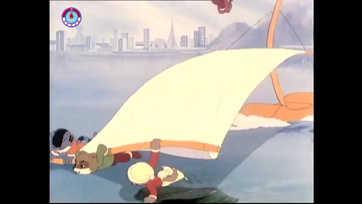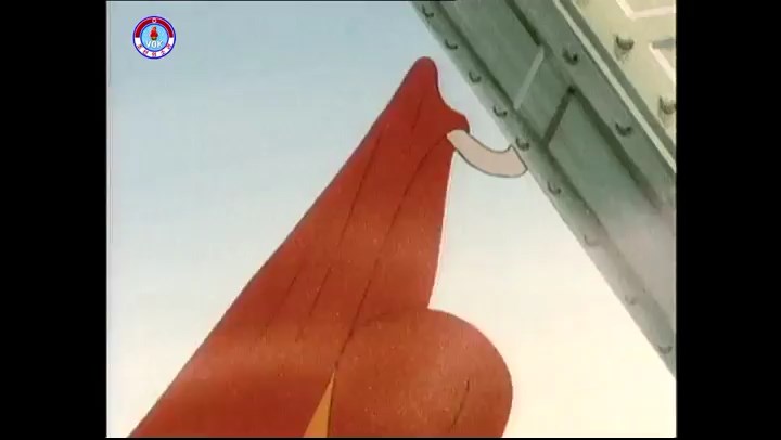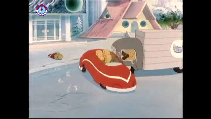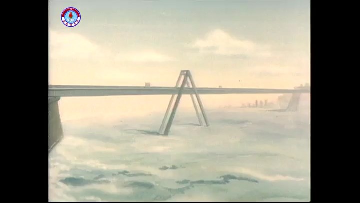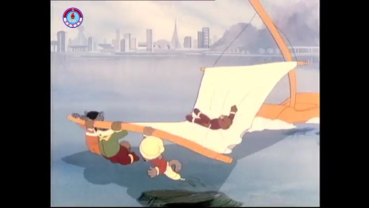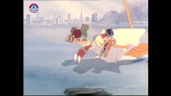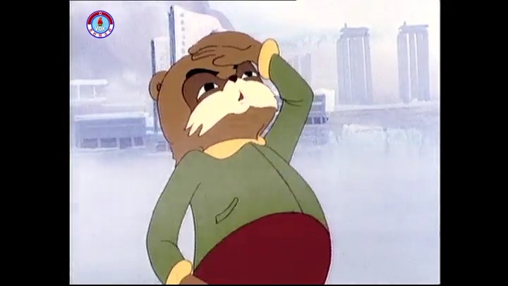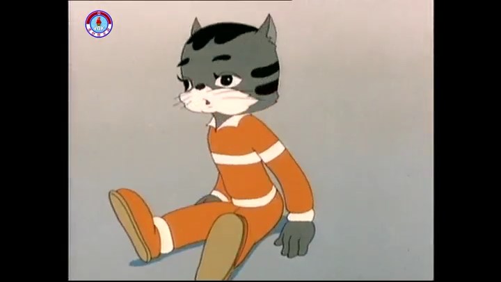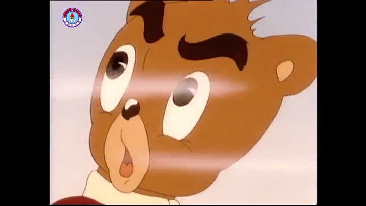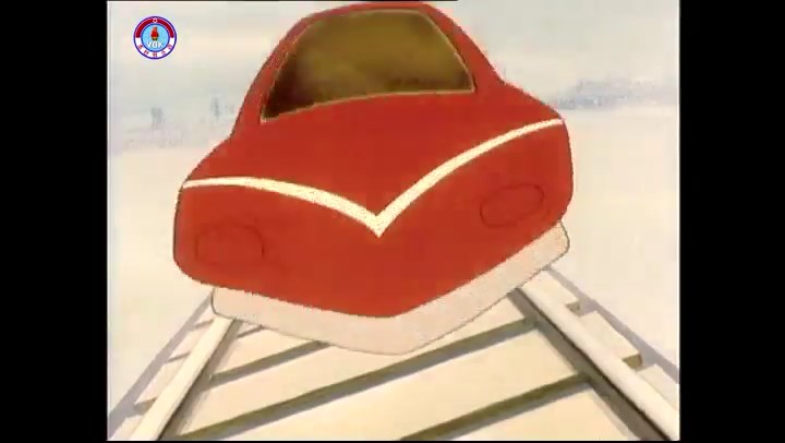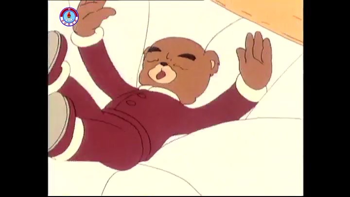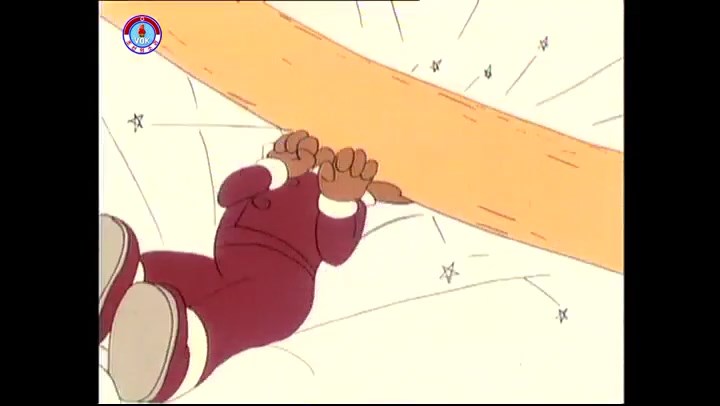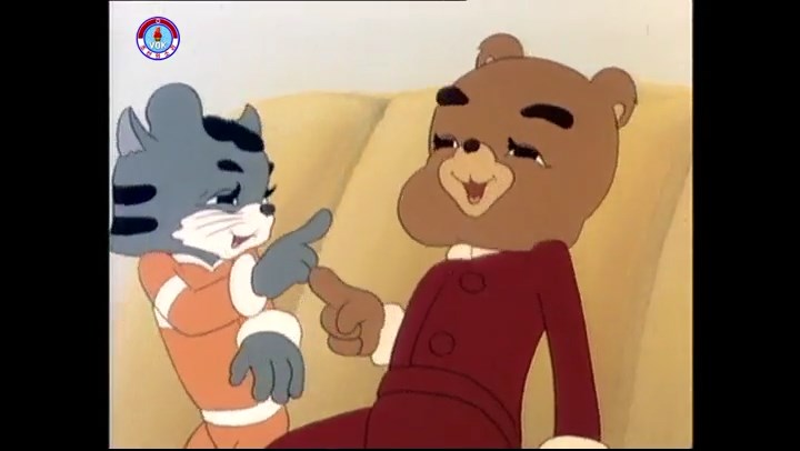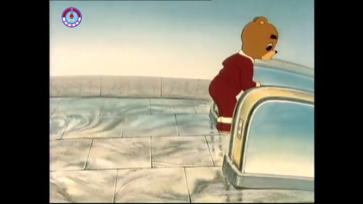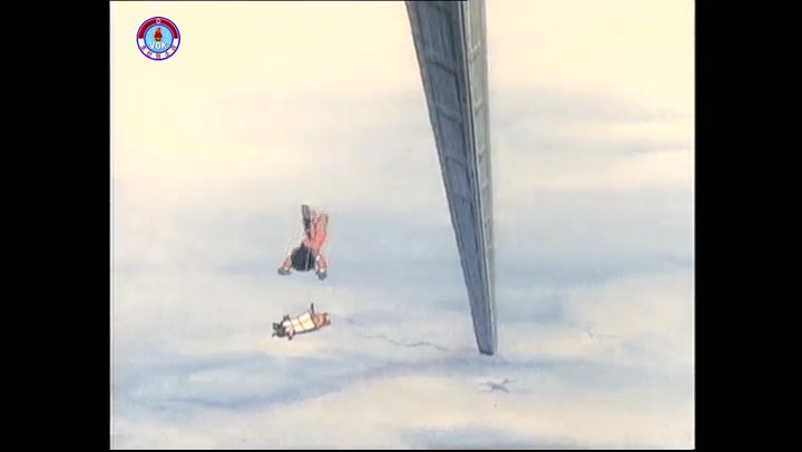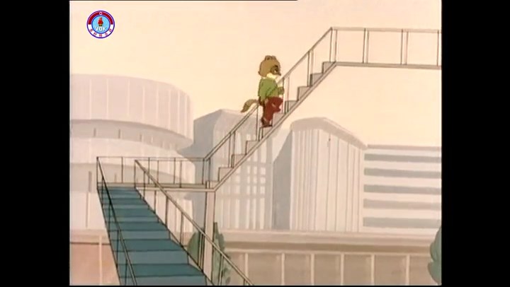 ※列車に撥ねられて鉄橋から落ちるネコとクマ。クマの服が鉄橋の金具?に引っ掛かってぶら下がる。そのクマの足に掴まるネコ。