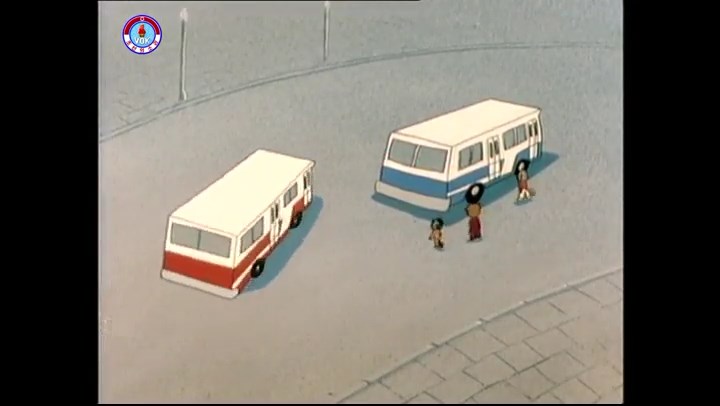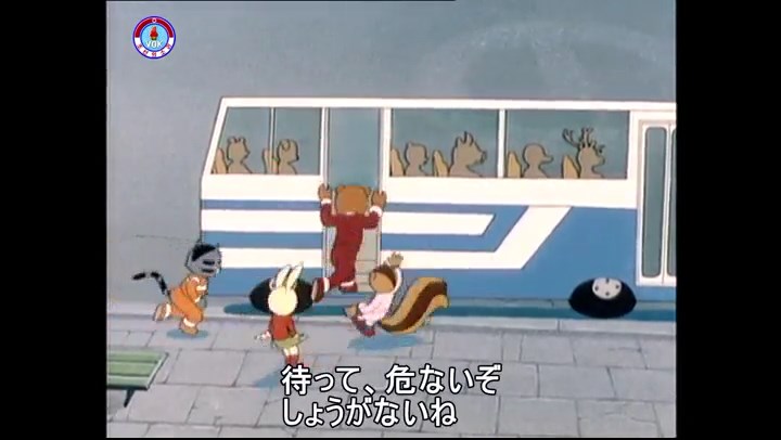 ※バスに乗ろうとする。別のバスが追い越していく。タヌキが乗っている。