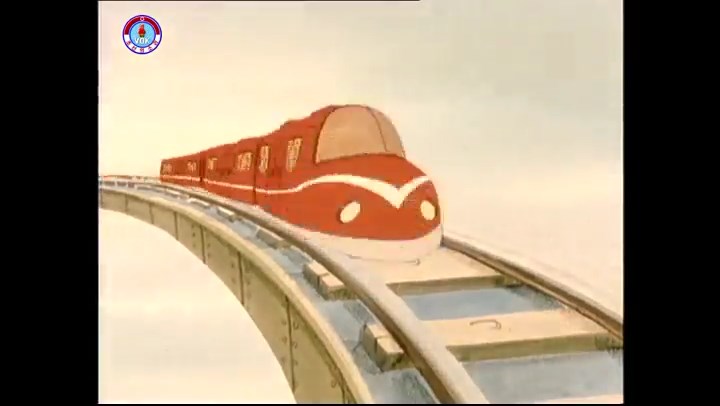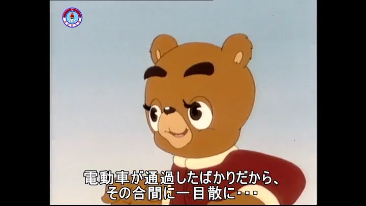 ※鉄橋を渡るネコとクマ、その後から列車がやって来る。