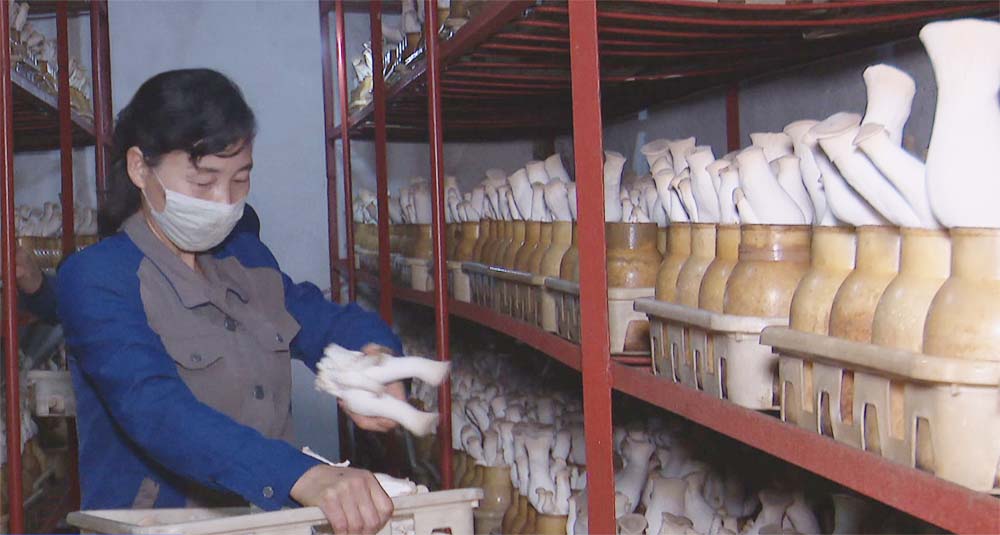 第8回党大会を勤労の成果で迎える一念に燃え、工場の従業員はキノコの生産に励んでいます。