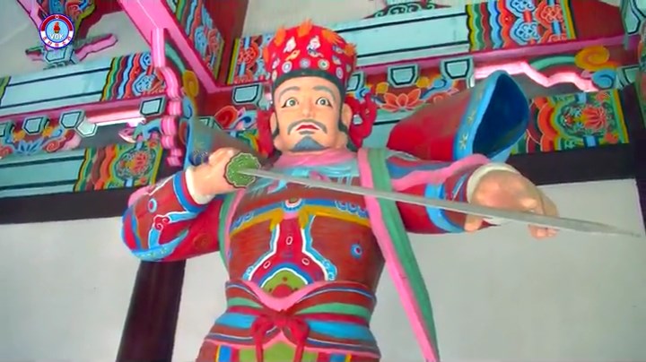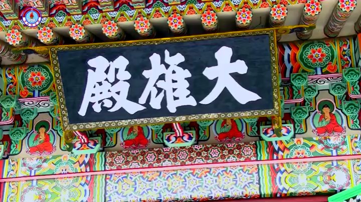 本堂の大雄殿は重厚な趣きの入母屋屋根の建物です。石を加工してきちんと積み上げた基壇の上に建つ正面三間、側面三間の大雄殿には、赤い円柱を立てその上に牛の舌模様の斗栱(ときょう*4)を置いています。建物の中には釈迦三尊が奉安され、掛け軸に描いた仏像もあります。梁等には金色に輝く赤と青のカラフルな模様が施され、建物の壮麗さを引き立てています。