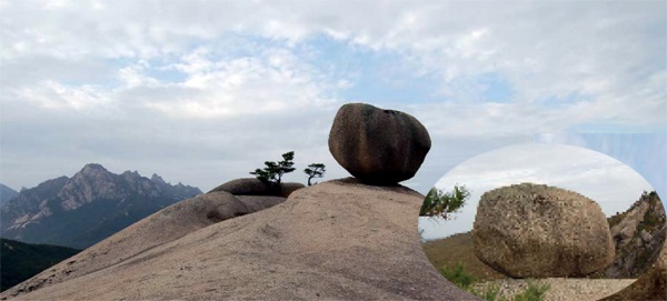 でっかい岩が平坦で広い岩の上に片方の端でくっついていますが、今にも転がり落ちそうです。でも重心が安定していて、長い歳月が経ってもそのまま維持しています。どの方角からも卵の形に見えるので卵の岩と呼ばれ、昔から多くの詩と歌で伝えられて来ました。