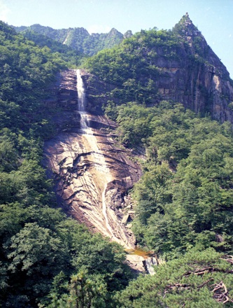 オクヨンの滝*5は、オクニョという峰とヨンランという峰から流れる水が合わさって落ちるということから、そう呼ばれます。滝の落差は31メートルです。周辺の生い茂る森とマッチして美しい景観をつくっています。