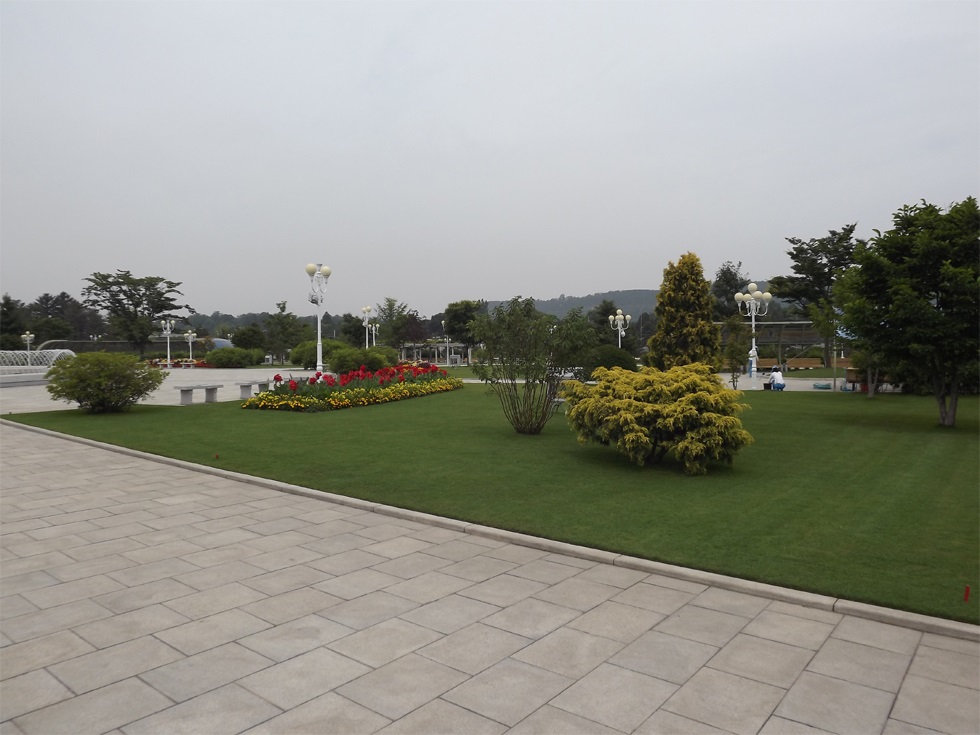 金正恩委員長のエネルギッシュな指導により、公園は短い間に立派につくられました。まさにクムスサン太陽宮殿の広場の公園は金日成主席と金正日総書記を永遠に指導者と仰ぐ金正恩委員長の気高い道徳的信義と熱い人民愛によってできた人民の公園です。