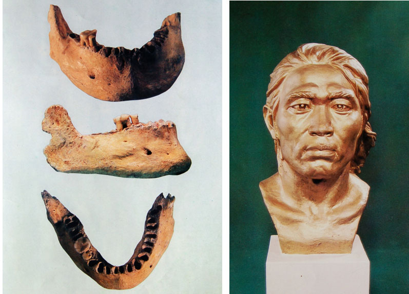 「スンリサン人」の下顎骨の化石と復元彫刻