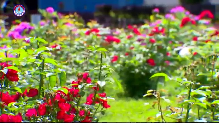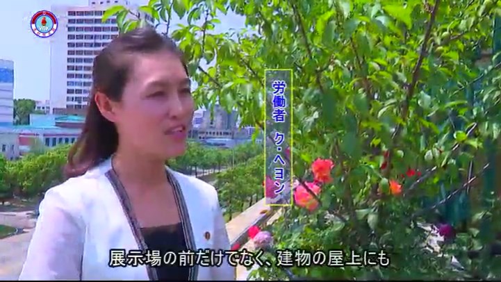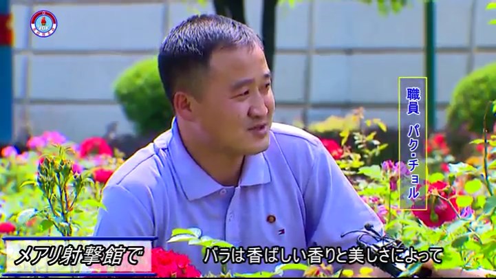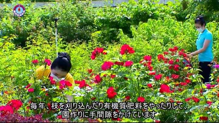 「バラは香ばしい香りと美しさによって朝鮮人民が愛着を抱いている花です。このバラの園は8年前に私たちがつくったものですが、10種類、数百本のバラを植え育てています。従業員が丹精して育てたので、株ごと、花が咲いています。バラは5月中旬から11月まで咲くのですが、直径20センチメートルの花もあります。毎年、枝を刈り込んだり有機質肥料をやったりして、園作りに手間隙をかけています」
