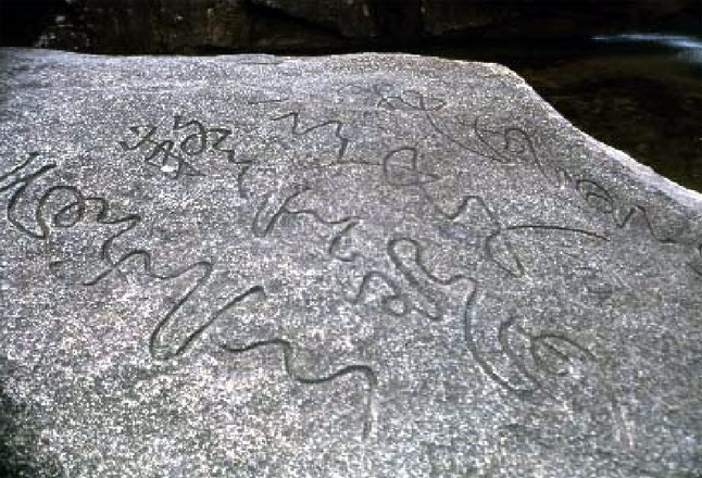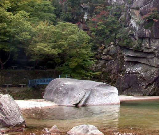 コモダムに水に浸かって、上の部分だけを出している丸い岩がありますが、これがリョン岩です。高さ4メートル、長さ8.4メートル、幅5.5メートルです。リョン岩には漢詩が刻まれています。16世紀前半を代表する女流詩人で名筆のファン・ジンイ*4が書いたものだと伝えられています。