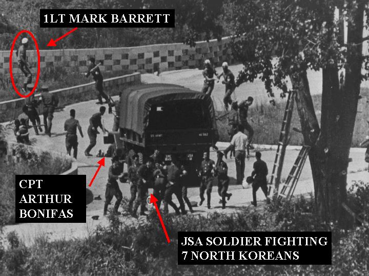 韓国軍兵士はトラックで北朝鮮軍の兵士に体当たりし、ボニファス大尉の体をトラックで守ったが、大尉は治療を受ける前に死亡した。彼らが殺害される様子は映画用カメラによって記録された。